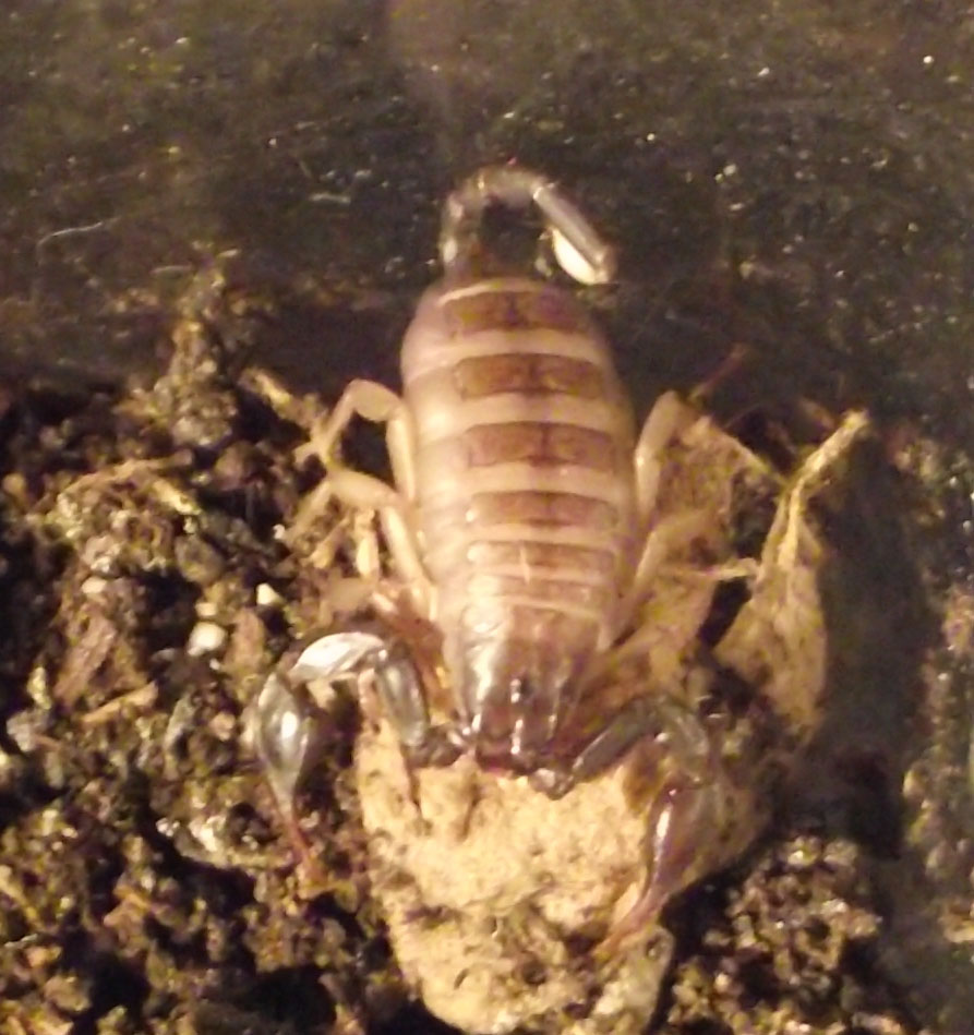Ecco aggiorno con una buona notizia...il piccolo scorpione sta per mutare...non mangia da un mese e l'ho trovato grassissimo sotto la sua roccia...mi hanno assicurato che è per via della muta...ecco na foto del ciccione...