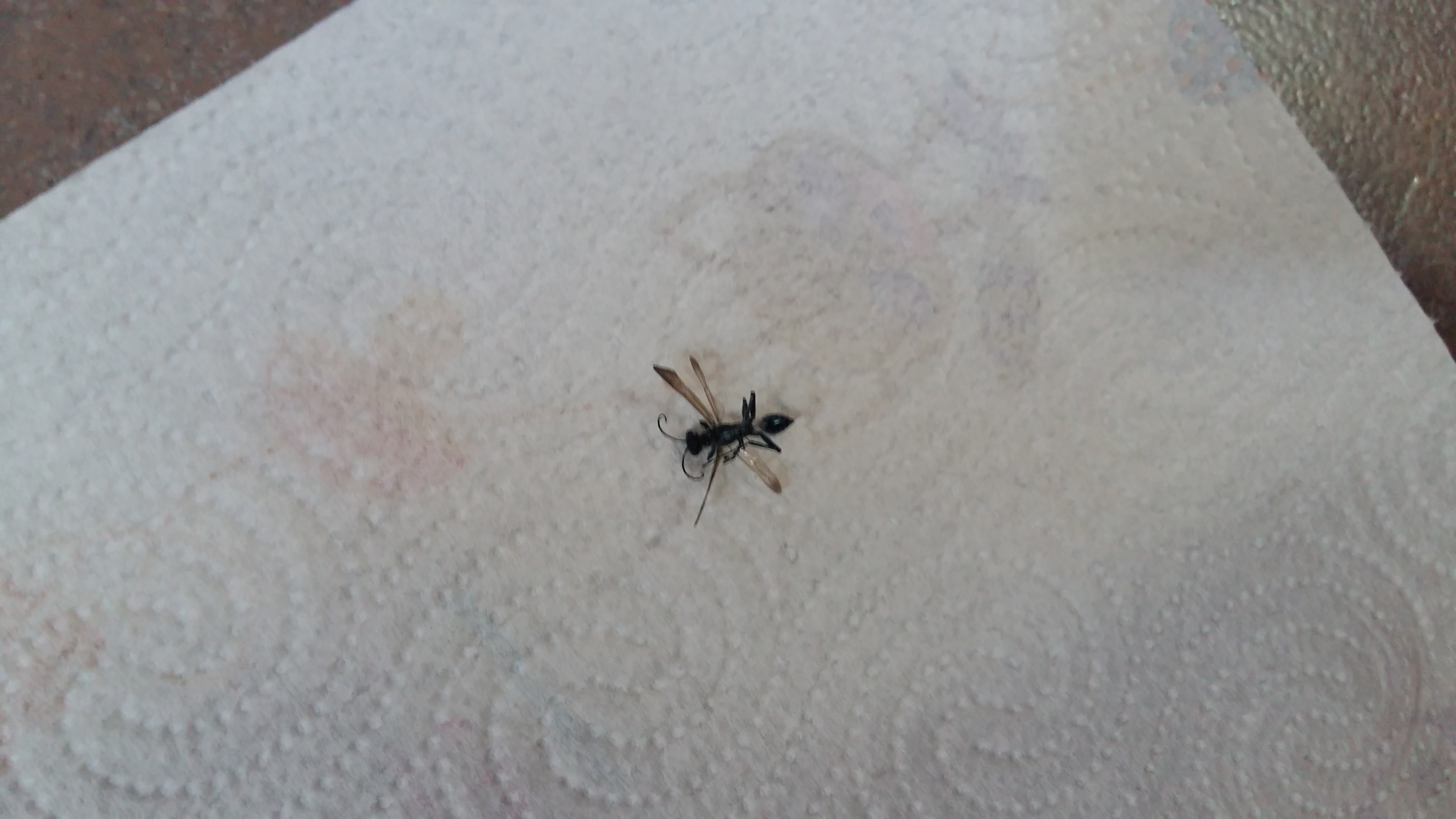 Non è una formica, ma uno Sphecidae. Alcuni Sphecidi scavano i nidi anche nel legno, quindi potrebbe anche essere lui il responsabile. Ad ogni modo, essendo bestie solitarie, non direi che l'integrità strutturale del tuo tetto sia a rischio se sono loro i responsabili, dato che non sarà un fenomeno sostenuto da un gran numero di individui (come nel caso di formiche o termiti). Dovresti però accertarti che siano davvero loro a scavare nel legno e creare quella segatura (in realtà è improbabile).