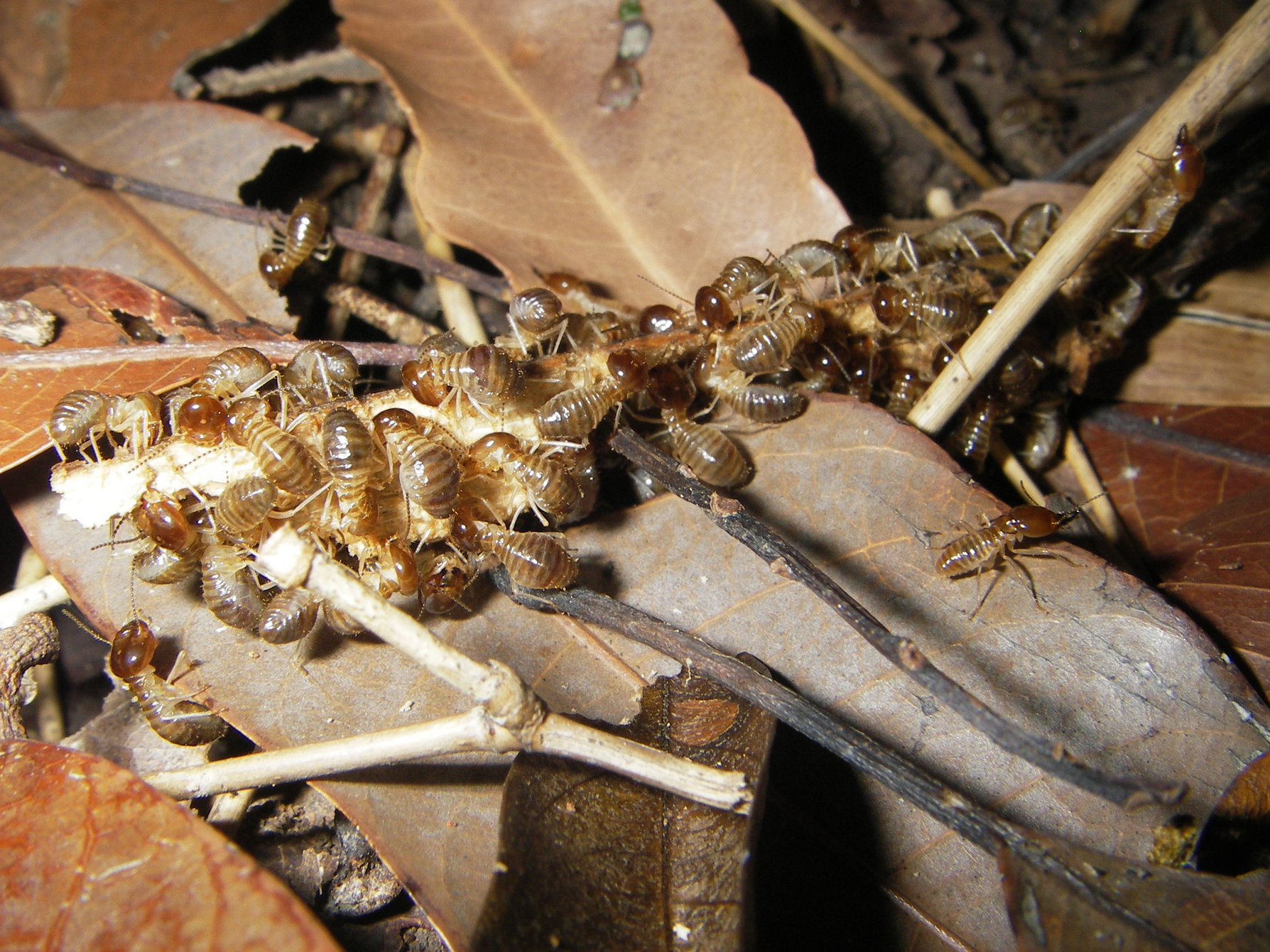 Ma queste proprio come formiche foraggiavano in colonne, piste lunghe vari metri, e protette da soldati. che io sappia solo alcune nasutitermes (termiti i cui soldati invece delle tenaglie hanno come arma una sorta di protuberanza sul capo sclerificato, a mo' di cannoncino che secerne sostanze repellenti e o appiccicose), e le Macrotermes, considerate le piu evolute, nidi popolosissimi, 2 caste di soldati, e coltivazione di funghi(termitomices)