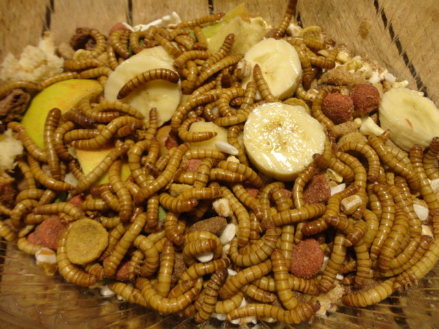 ,come avevo scritto nel topic della sezione scambi,sono riuscito a trovare,in un negozietto,delle camole della farina(tenebrio molitor).Avrei voluto chiedervi qualche consiglio sull'allevamento,per ora gli ho messo qualche pezzetto di mela e fettina di banana,pane grattato,2 biscotti grattugiati in modo fine e un po' di crusca e semini.Siccome sono tutte oltre i 3cm,come si vede dalle foto,le ho messe in un cassetto remoto della casa al buio e in mezzo ai vestiti in modo da limitare le vibrazioni poiché dovrebbero impuparsi,stando a quanto ho letto in giro.Avreste qualcosa da consigliarmi??