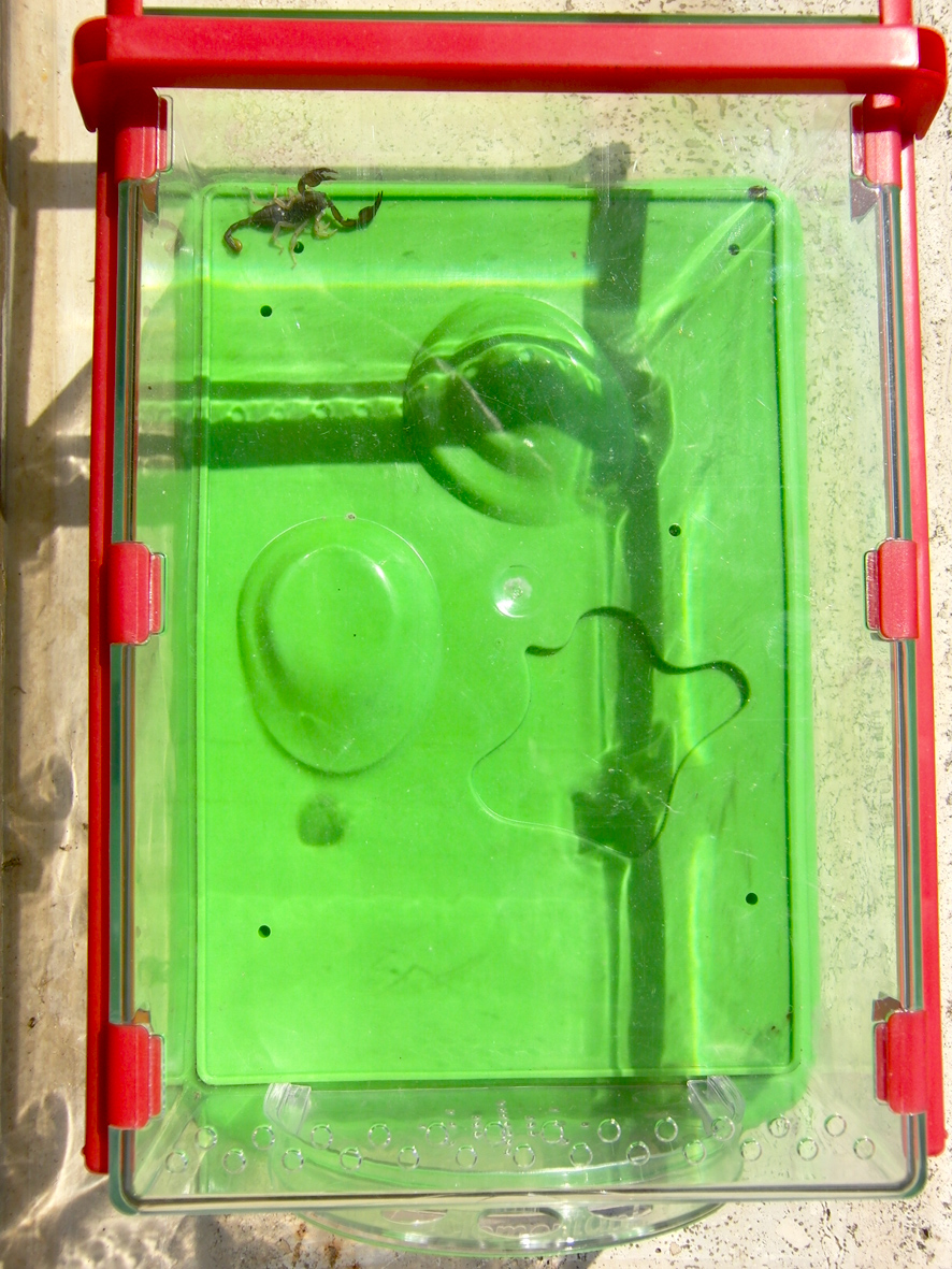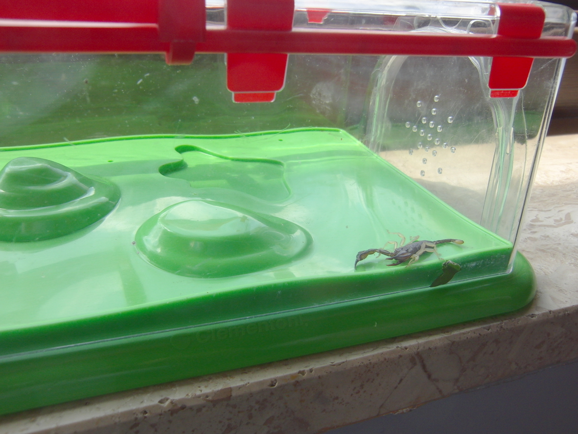 Ecco le foto del mio scorpione e del suo terrario.La sua alimentazione consiste in:mosche stordite e ragni. Ciao e grazie