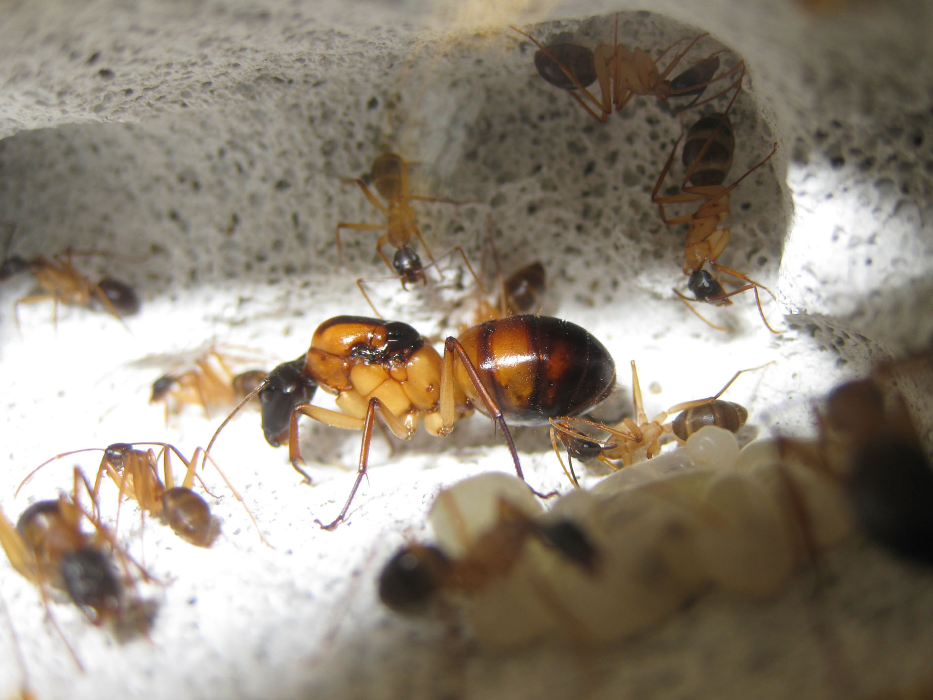 Nell'ordine: Opistopsis rufoniger, Camponotus nigriceps, con la regina ancora in buona salute, e la covata delle Iridomyrmex.