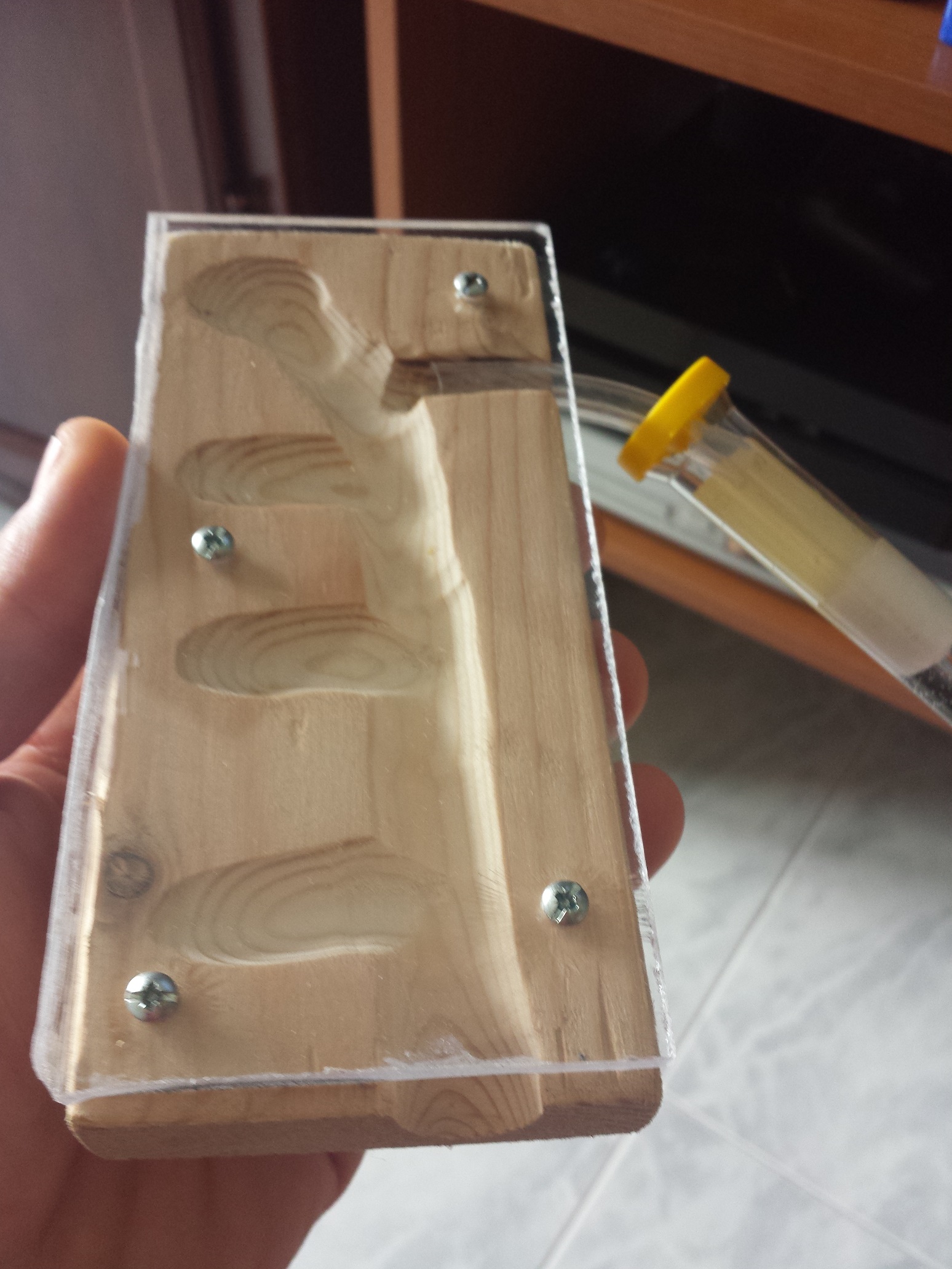 buona sera a tutti,eravamo rimasti a 4 operaie e 5 bozzoli con molte uova e qualche larva.La situazione ora è che sono sfarfallate 2 operaie due giorni fa e erano di colore molto chiaro mentre ora sono scure quasi come le altre 4.la domanda che voglio porvi è la seguente,l'acqua nella provetta sta finendo e siccome ho graffiato la provetta,prima di metterci dentro la colonia,con una retina perchè volevo togliere la colla dell'adesivo che la ricopriva ho costruito un nido più grandicello e in legno visto che la specie predilige nidi di questo materiale.posto qualche foto e vorrei sapere come trasferirle e se comunque come nido va bene oppure no grazie in anticipo.