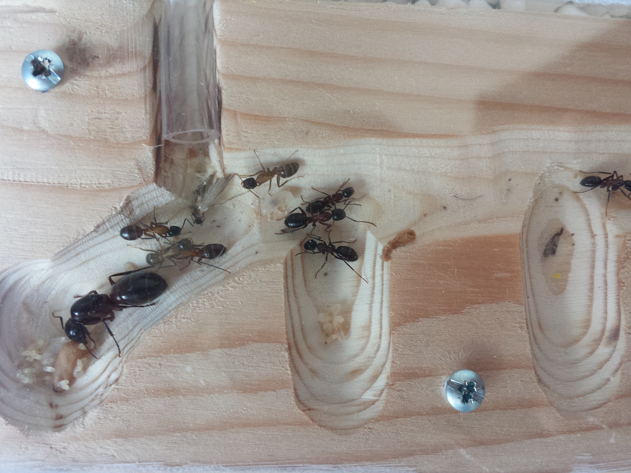 buona sera,inizio qui il mio diario per parlare della mia minuscola colonia di Camponotus ligniperda.l'anno scorso ho iniziato ad allevarle ma per vari motivi sono dovuto andare via di casa in inverno mentre erano in letargo e quando sono tornato,dopo le feste di natale credendo che fossero morte,trovo una bellissima sorpresa.Le mie Camponotus stavano benissimo quindi le ho tolte dalla cantina dove faceva abbastanza fresco e le ho messe in casa dove il clima è pochino più caldo.nel giro di pochi giorni la regina ha deposto una 15 di uova ma solo dopo che le operaie le hanno portato da mangiare e ora quelle uova si sono evoluti in sacchettini di colore giallo e in particolare una ha assunto di uno scheletro di formica.comunque mi sembra che stanno abbastanza bene e che tutto sia nella norma.