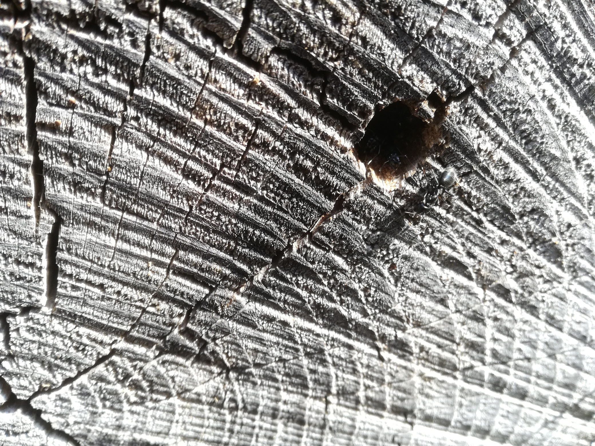 Devo dire che a prima vista sono rimasto impressionato dalla vastita' di territorio che un solo formicaio riesce a coprire, a partire dal tronco infatti si diramano colonne di Major che pattugliano in ogni direzione, fino ad un raggio di oltre 20 metri e forse oltre. Purtroppo non ho fatto molte foto, avendo solo uno smartphone come strumento, ma sono comunque riuscito ad immortalare l'entrata di uno di questi nidi, che vi posto di seguito.