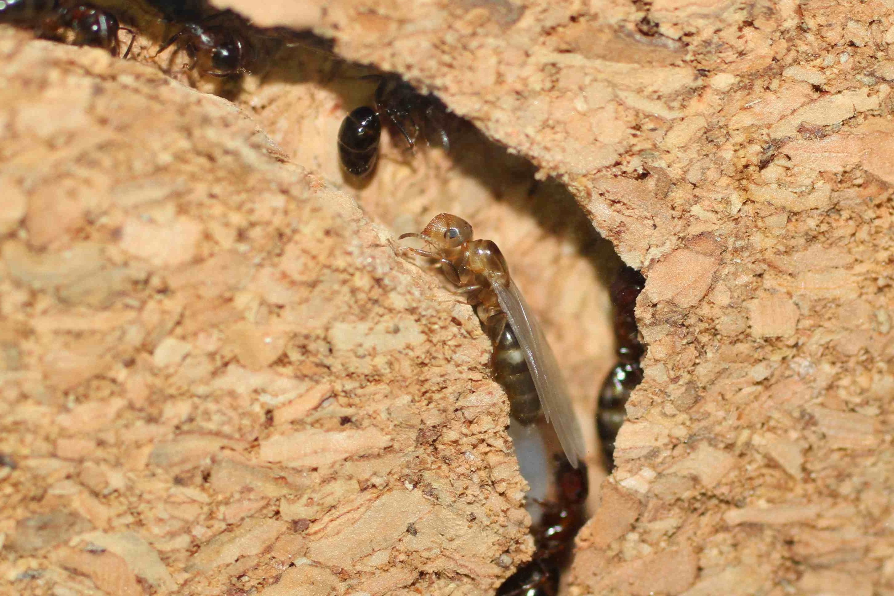 Allego un po' di foto di alati della colonia di C. truncatus che sto allevando. Qualcuno sa se è possibile che maschi e regine della stessa colonia si accoppino? Nella scheda ho letto che il volo degli alati di questa specie comincia ad aprile-maggio, e l'anticipo nella mia colonia può essere legato alla temperatura, che a casa è più alta di quella esterna. Volendo liberare gli alati appena la temperatura esterna aumenta, c'è qualche motivo che sconsigli di liberare alati nella zona da cui la colonia proviene?
