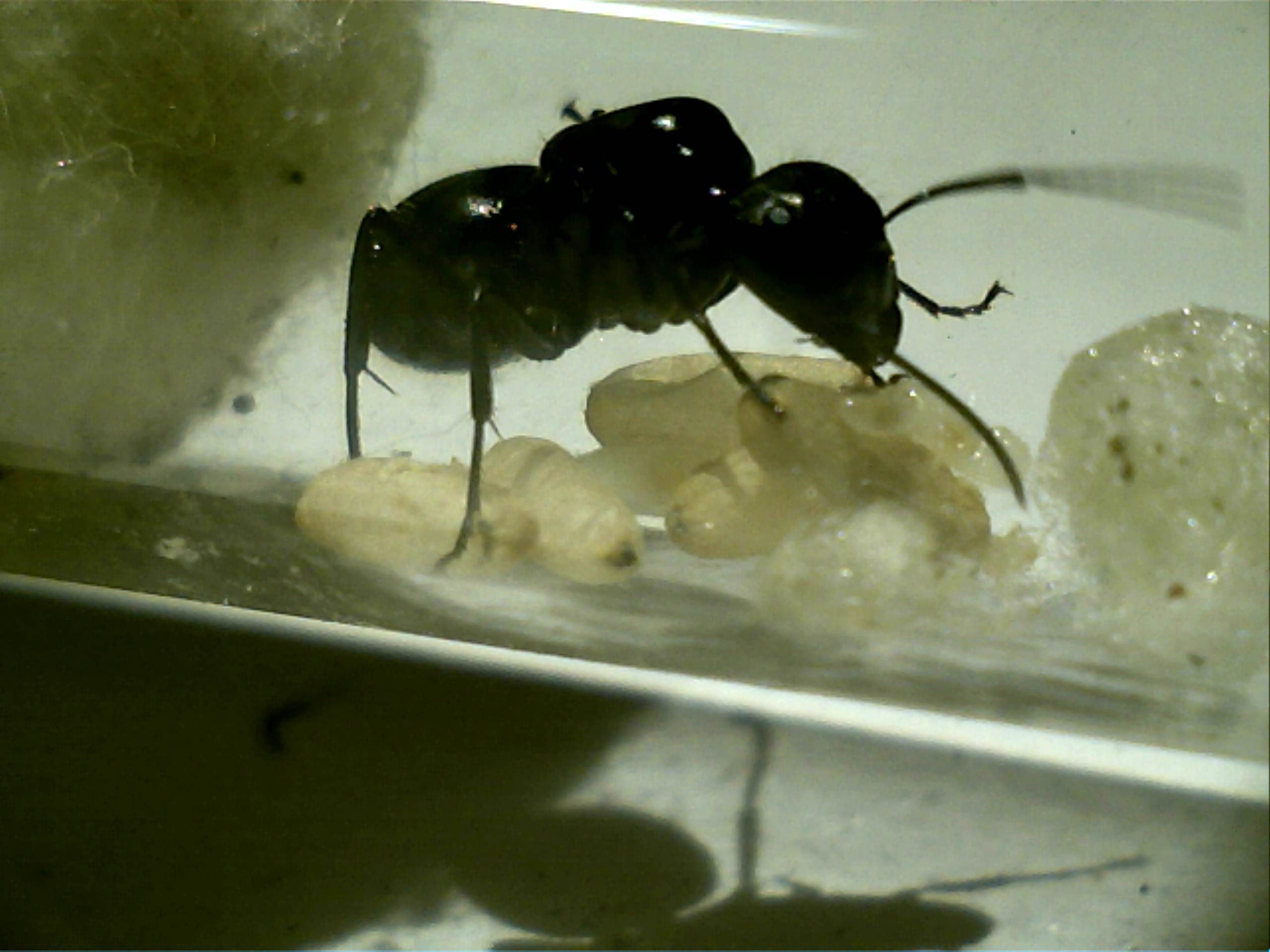 Io ne ho trovate 2 a metà maggio, hanno fatto subito le uova, poi una delle due ha lasciato perdere le uova che sono diventate nere e si è lasciata morire, l'altra ha portato avanti 6/7 bozzoli. L'altro giorno si è schiuso il primo e... l'operaia è rimasta 2 giorni a "pancia" in su muovendo appena le zampe e ora è morta, gli altri bozzoli invece si stanno scurendo e non mi fanno sperare nulla di buono... Mah magari le ho trovate subito dopo una passata di disinfestazione sulle piante...
