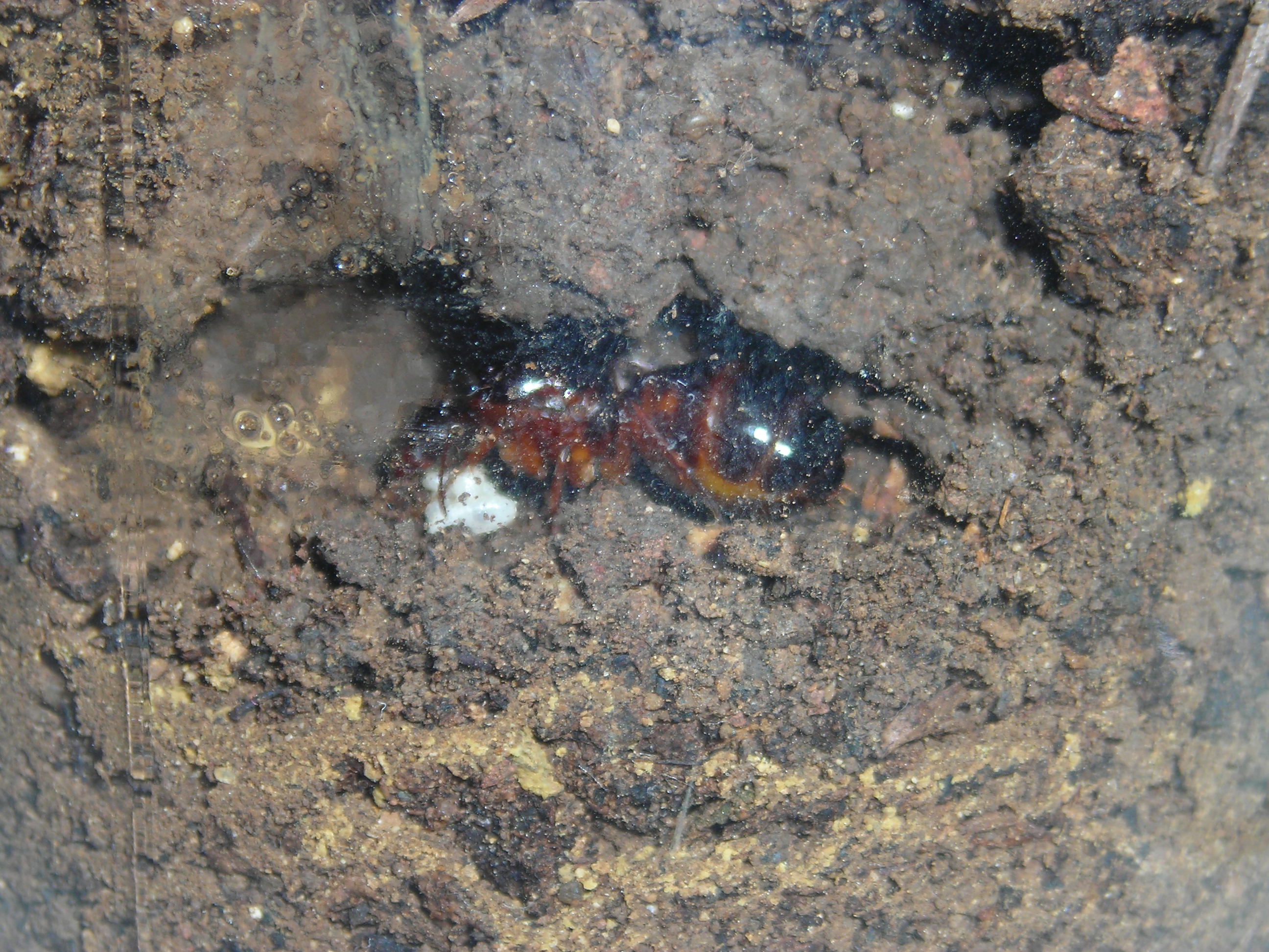 No, ha fatto tutto lei... Ancora esce per sistemare l'entrata e so anche il perchè credo che abbia capito che dove sta è protetto per questo esce per sistemare il terreno sopra, ma poi entra e cura le larve io credo che su questa specie in particolare si dovrebbe fare una scheda di allevamento , oltre alla fondazione in provetta si puó parlare dei pro e dei contro che ha la fondazione in un barattolo con terra