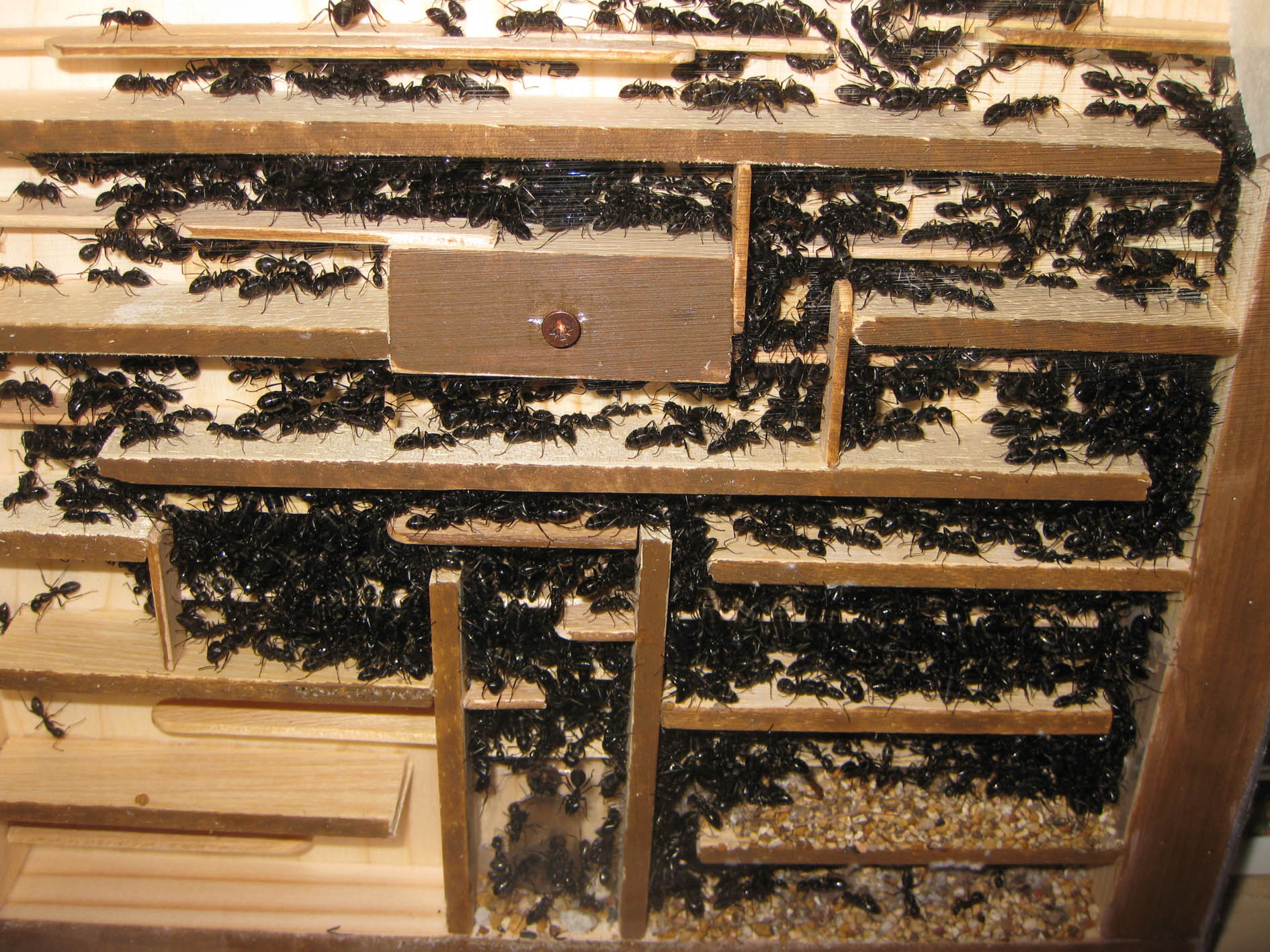 Tutta la colonia si è ritirata nel settore centrale del nido, che, come sapete, è diviso in tre lastre di legno di 1,5 cm (in definitiva almeno 3 cm effettivi di spessore proteggono il nucleo centrale); la facciata di mezzo è la meglio protetta dal freddo, e qui si trova una quantità imprecisata di formiche. Piccoli gruppi sono sparsi anche qua e là, sotto la protezione esterna di fogli di polistirolo a contatto del vetro.
