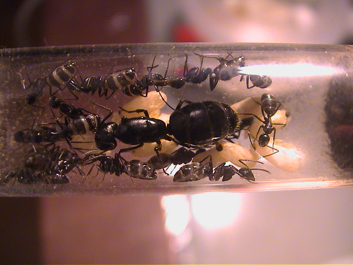 Le operaie ormai sono sempre più statiche e non le vedo più in arena a foraggiare. Le temperature qui negli ultimi giorni si sono abbassate parecchio e in casa ho una temperatura di circa 19/20 gradi di giorno, probabilmente di notte scendono ancor di più. Tra tutte le specie che allevo, le Camponotus vagus si sono rivelate le più sensibili all'abbassamento delle temperature.