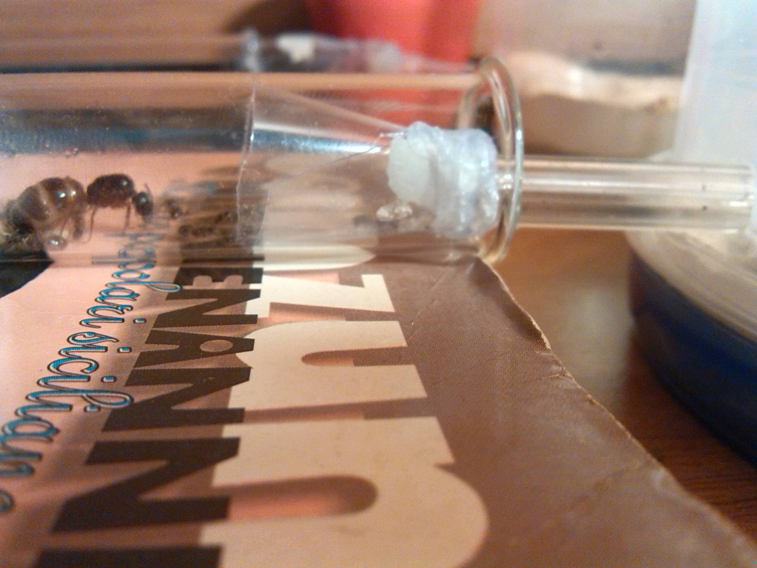 E' da più di una settimana che la colonia non tocca cibo malgrado io abbia fornito in arena una gocciolina di miele ogni 2 giorni e un insetto ogni 3...quindi anche se le operaie hanno quasi tutte il gastro dilatato(perché la regina le nutre)ho deciso di infilare una zampetta di grillo nel tubo di collegamento e dopo un'ora e mezza è stata presa e mangiata!!!