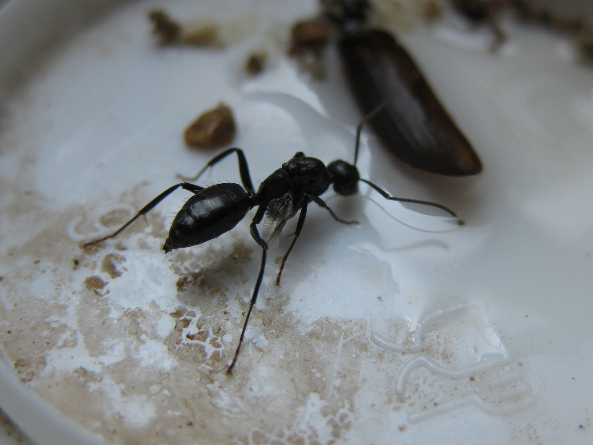 Resta un caso unico fra quelli che ho visto e sentito, eppure i maschi ci sono, sono all'opera o comunque non elemosinano cibo alle operaie, bensì tentano di riportarlo nel nido. Forse aver perso le ali li trasforma automaticamente in... "qualcos'altro”?