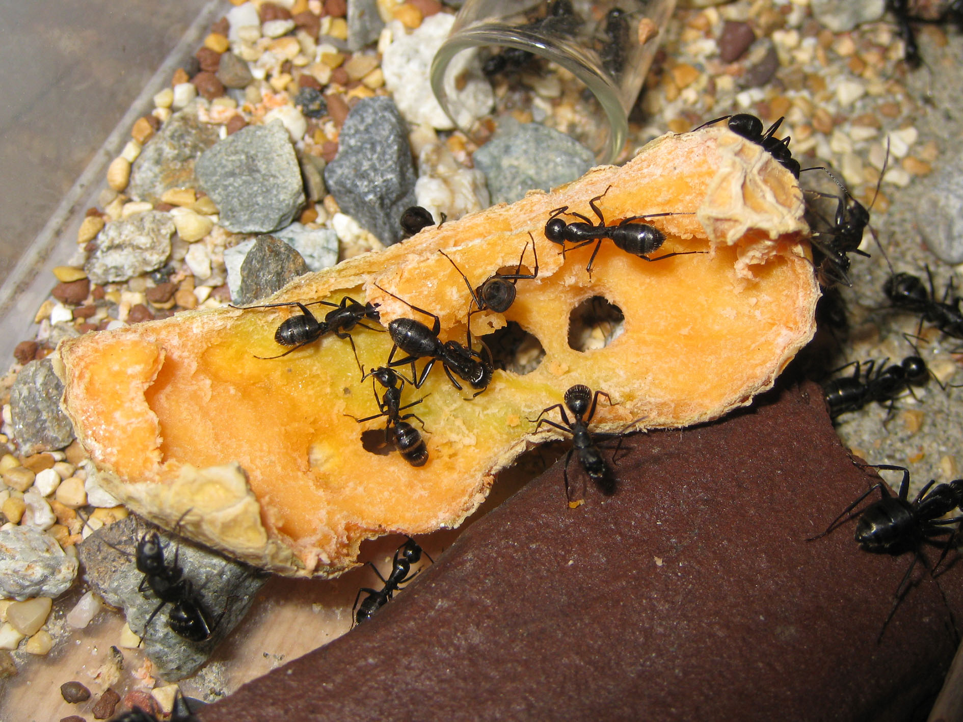 Ora, sorvolando sulle diversità alimentari che possono essere notevoli fra Messor, Formica e Camponotus, mi trovo a segnalare differenze notevolissime fra due uguali colonie di Camponotus vagus: nella fattispecie la colonia più giovane (che per le mie esperienze dovrebbe avere una gamma di gusti meno varia rispetto alla colonia adulta) gradisce e saccheggia per ore e giorni questo alimento, mentre la colonia più grande, dopo un primo approccio che stimo più interessato all'umidità del frutto che alla sostanza, abbandona completamente a sé stessa la fetta di melone, mentre l'altra... Giudicate voi!