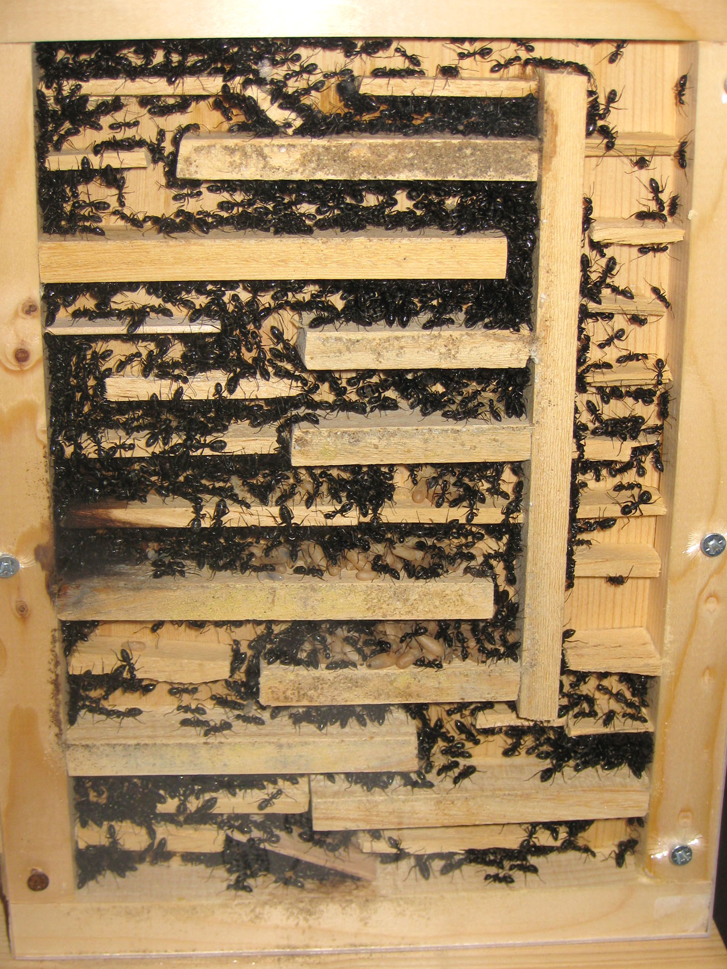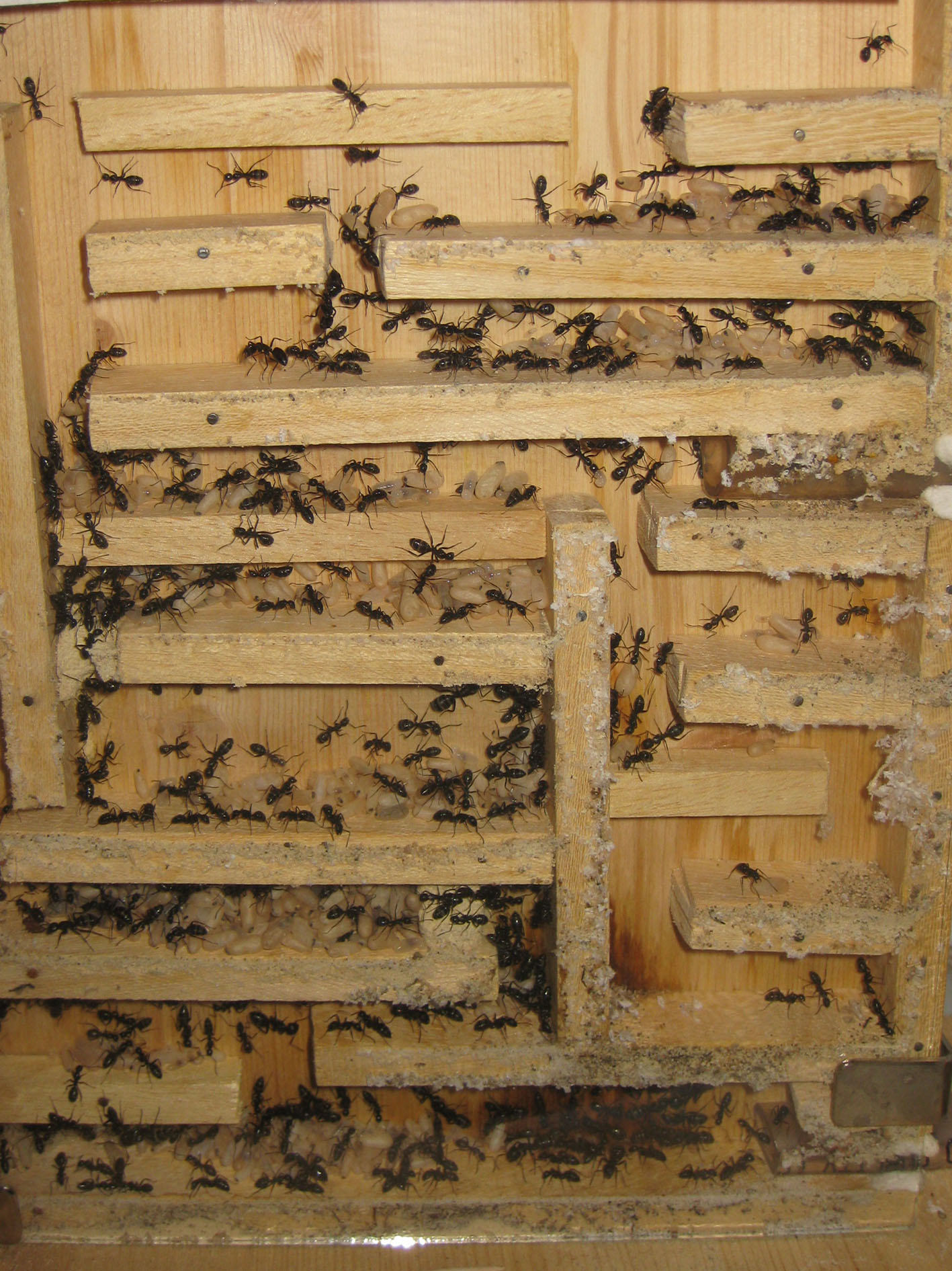 Dove c'è un'unica uscita e una fonte di calore localizzata su una struttura di legno (tengo alcune ore giornalmente un tappetino riscaldante sul retro della parete di fondo, dato che casa mia è abbastanza fredda), le formiche si organizzano di conseguenza, mentre tu che hai le varie stanze divise su diverse facciate di un nido di gesso, non hai un luogo preciso in cui le formiche pensino di dover accumulare la covata.