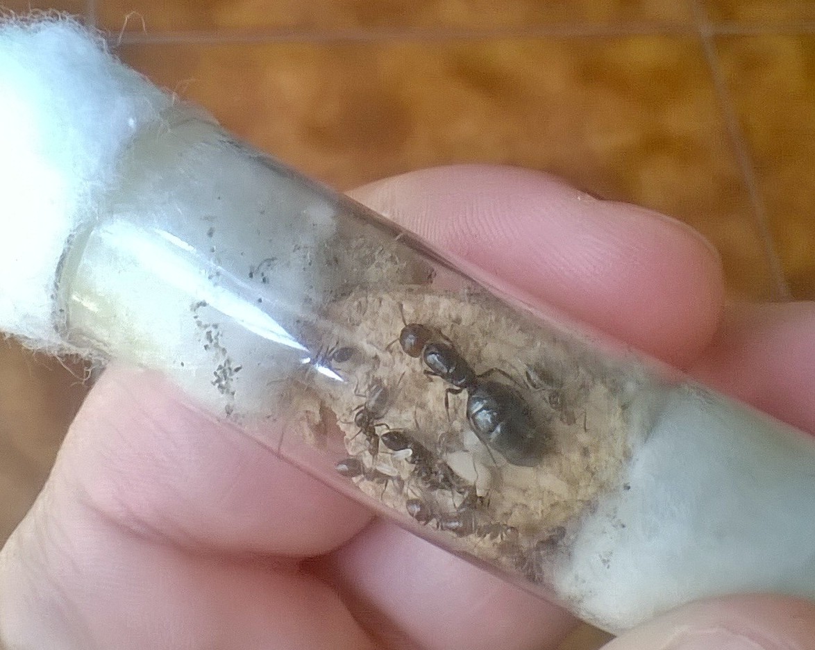 Ho tre C. lateralis che fino a oggi si son comportate a dovere: nessun tentativo di fuga, avanzi sempre sullo stesso punto, un po' di capricci con l'alimentazione..tutto negli standard..ho dovuto lasciare le formiche da sole per due settimane in agosto, riuscendo a nutrirle per bene prima e riuscendo a offrire un po' di miele tra le due settimane..al ritorno le ho trovate aumentate, con poche larve, qualche pupa e praticamente niente uova..non mi stupisce, so quanto siamo lente..solo che mi sembravano contratte, affamate..ho offerto miele, zanzare e..tonno! Hanno apprezzato e attualmente la maggior parte delle operaie ha il gastro pieno..ma qualcuna (le più piccole, mi sembra) sono piuttosto contratte..e le regine..1 si è ingrossata, ma 2 sembra non aver toccato cibo..(3 é una via di mezzo)..ho fornito altre zanzare a 2, anche se le sue operaie sono piuttosto in forma..sono solo paranoie mie? questa é 2 e questa è 1