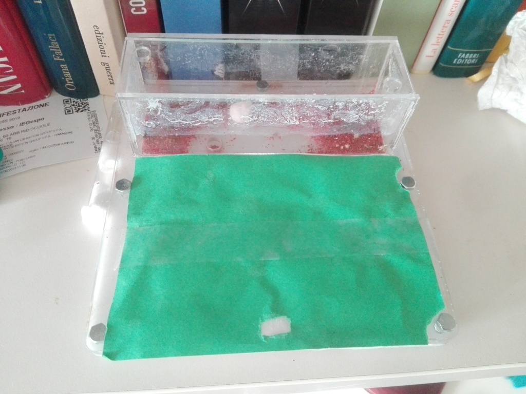 Per concludere, sto pensando di collegare una arena più grande al nido, facendo passare un tubicino attraverso un foro all' interno del nido, in quanto l' arena presente al momento presente è molto piccola, l' antifuga sta perdendo efficacia e questo rende difficile le operazioni di pulizia.