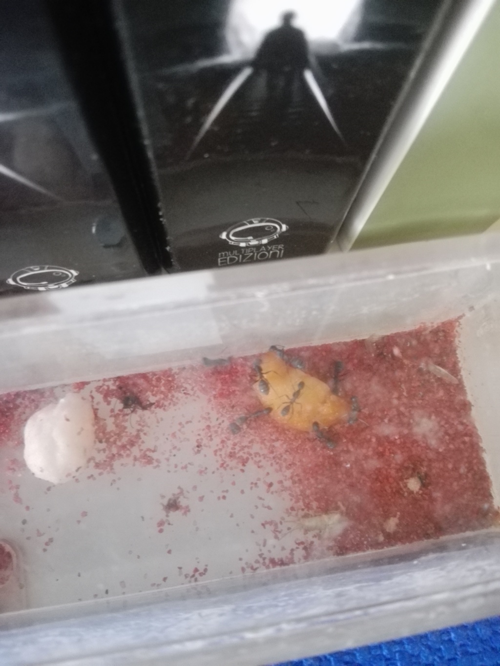 13-05-2019- la colonia è arrivata di lunedì. Ho aperto la scatola e ho sistemato le regine in un cassetto, poi ho visto il nido delle Camponotus capovolto. Panico! Le ho rimesse dritte ma alla fine stavano bene, la situazione era la seguente: 22 operaie, 7 pupe, 8 larve, una decina di uova e ovviamente la regina.