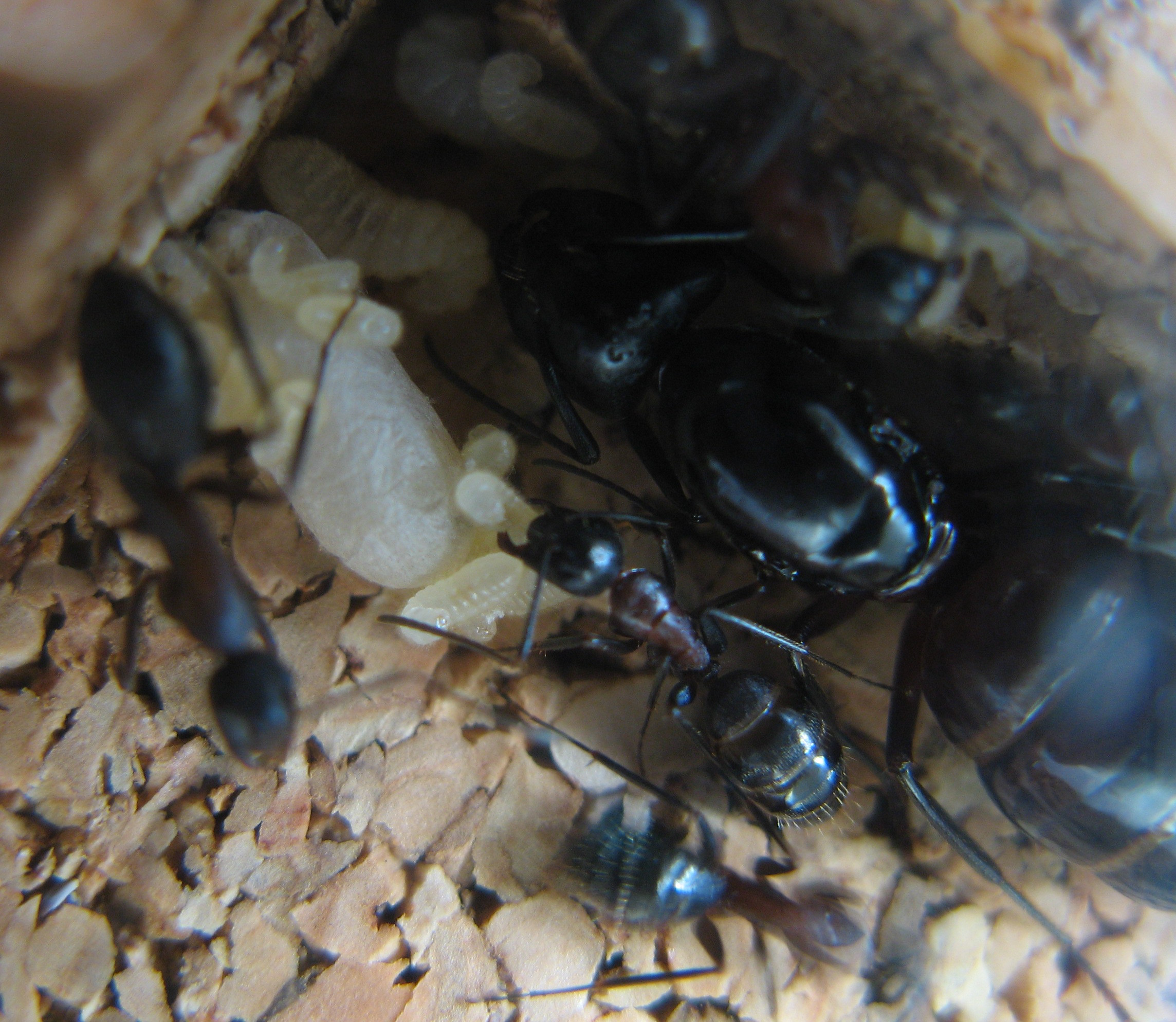 ) una regina di Camponotus ligniperda sciamata presumibilmente l'anno scorso. Questa regina ha fatto le prime uova ai prima di aprile... la cosa curiosa è che le operaie sono nate lo stesso giorno delle mie. Inoltre i suoi bozzoli hanno impiegato oltre un mese a sfarfallare, mentre quelli di Mafalda ci hanno messo meno della metà del tempo.