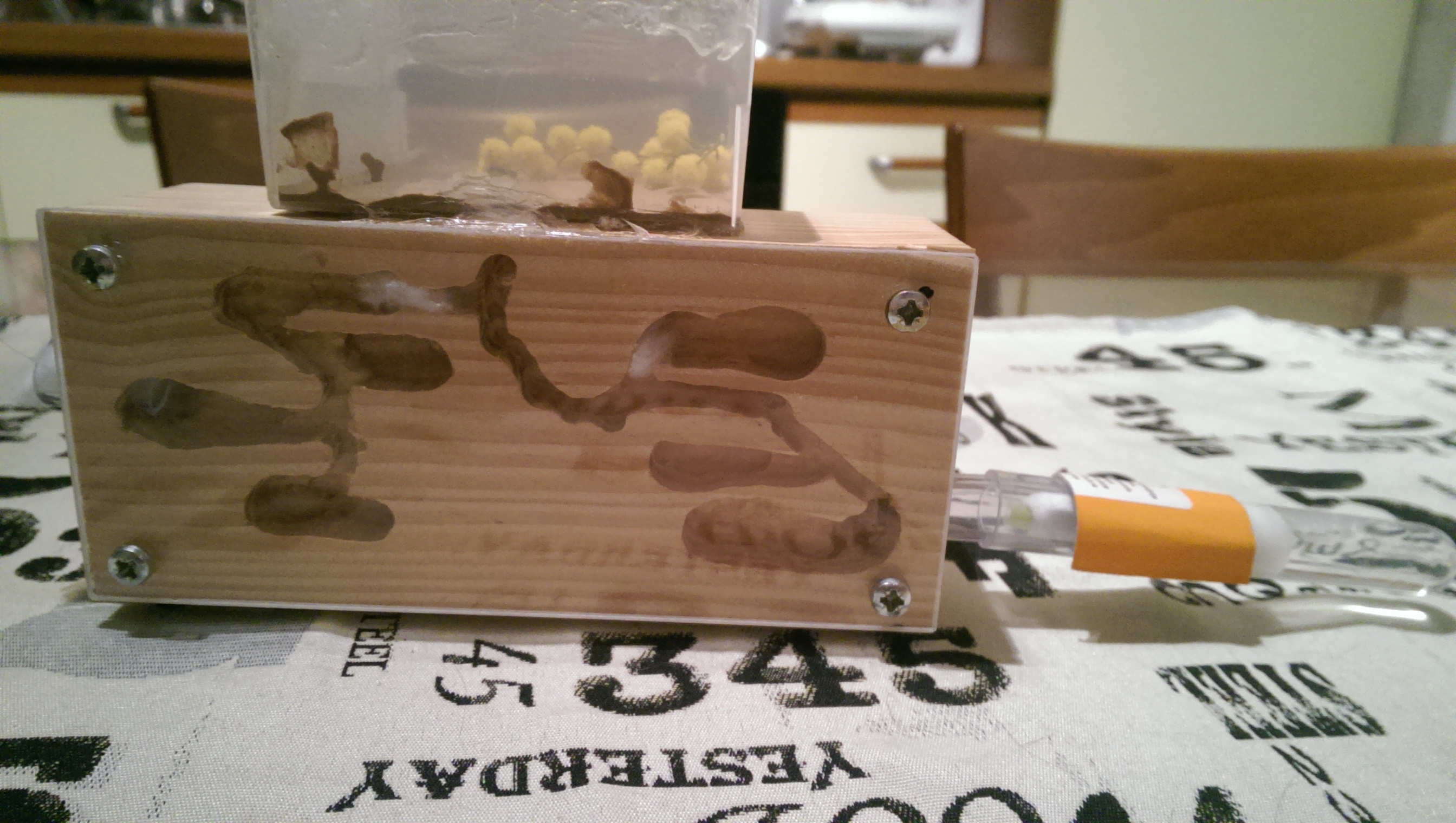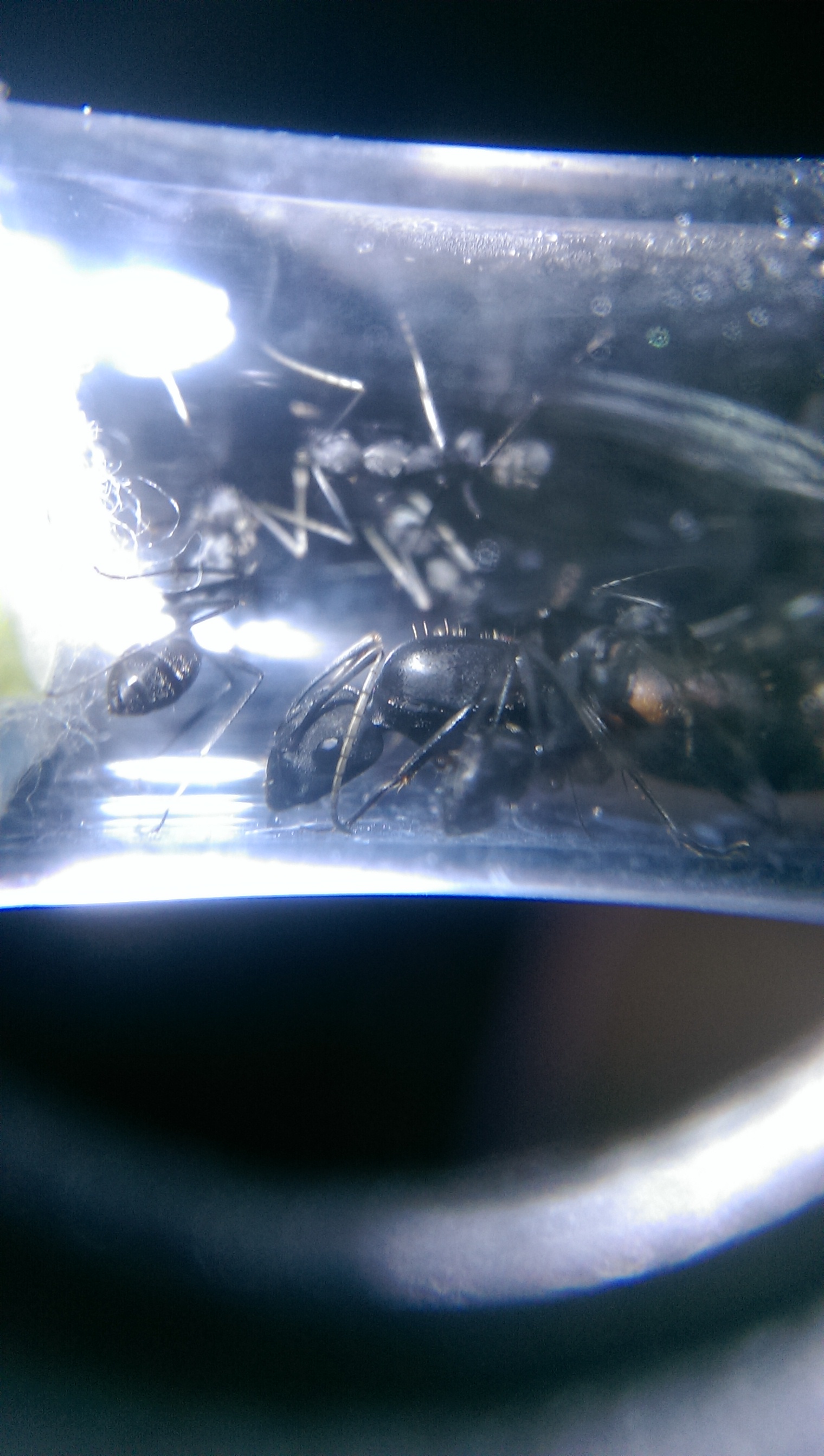 ho fatto un'ordine nel solito negozio spagnolo per acquistare una lente seria,e non ho resistito,ho ordinato una colonia di queste incredibili formiche.Oggi sono arrivate,me ne hanno mandate due con 8-9 operaie e un bel po di larve,da subito ho constatato il coraggio di questa specie,tolto il cotone per dare un po di miele per tirarle un po su dal viaggio,è partita una subito a cercar di mordermi!Ho capito che era impossibile dare da mangiare senza causare uscite o stress,quindi ho aggiunto una seconda Camera fatta con un tubicino.Vi metto un paio di foto fatte col telefono e con la lente 30x con led che non so come ho fatto senza fino adesso,sembra di entrare dentro la provetta!:mrgreen::mrgreen: