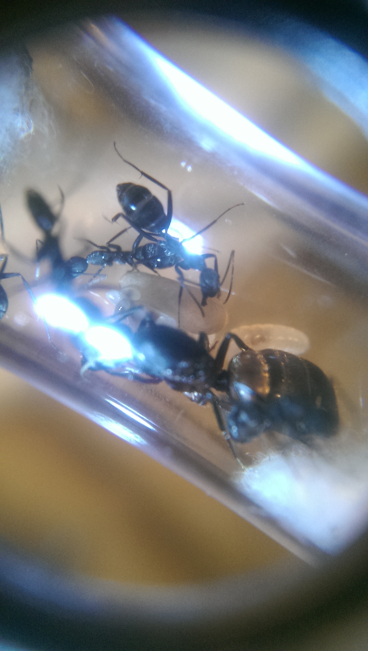 Lo so che non si acquistano colonie,lo so che non si acquistano colonie "esotiche",ma si sa,l'occasione fa l'uomo ladro...:)ho fatto un'ordine nel solito negozio spagnolo per acquistare una lente seria,e non ho resistito,ho ordinato una colonia di queste incredibili formiche.Oggi sono arrivate,me ne hanno mandate due con 8-9 operaie e un bel po di larve,da subito ho constatato il coraggio di questa specie,tolto il cotone per dare un po di miele per tirarle un po su dal viaggio,è partita una subito a cercar di mordermi!Ho capito che era impossibile dare da mangiare senza causare uscite o stress,quindi ho aggiunto una seconda Camera fatta con un tubicino.Vi metto un paio di foto fatte col telefono e con la lente 30x con led che non so come ho fatto senza fino adesso,sembra di entrare dentro la provetta!:mrgreen::mrgreen: