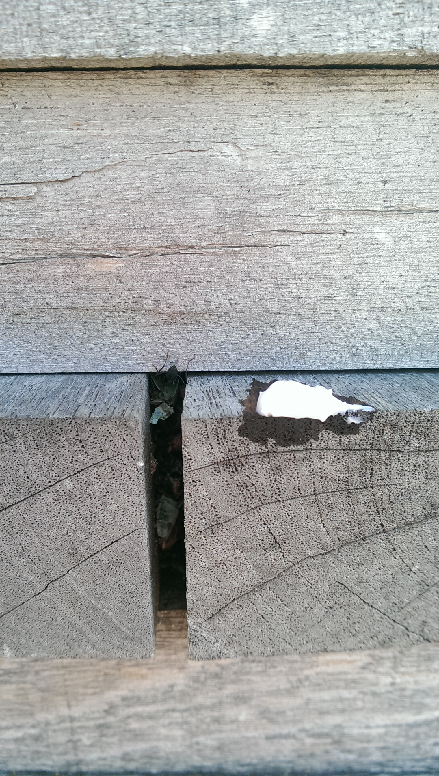 2)la piu plausibile,hanno colonizzato gli spazi fra i pezzi di legno,nella foto infatti si vede un mucchio di scarti che tappano una fessura.