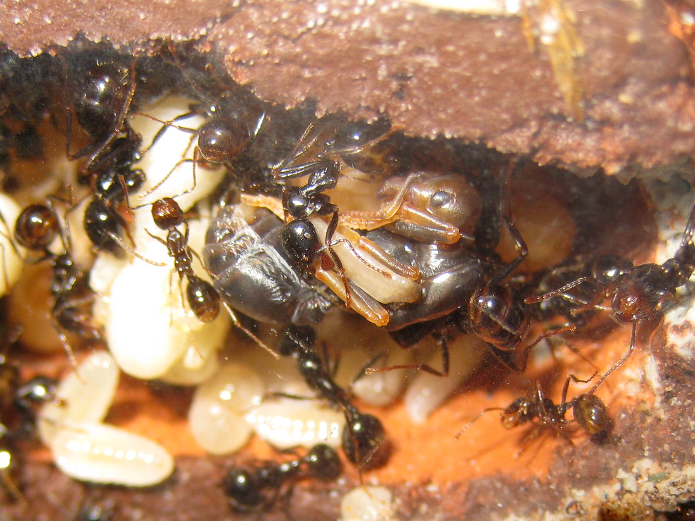Un primo particolare da notare: le pupe sono sempre tenute in questa posizione da un'operaia addetta; la presa è regolarmente sul peziolo, la parte più sottile afferrabile da una singola operaia, ma potete anche osservare la cooperazione di più operaie piccole disposte a "ragno” che sorreggono una singola pupa in una rete di zampe e mandibole.