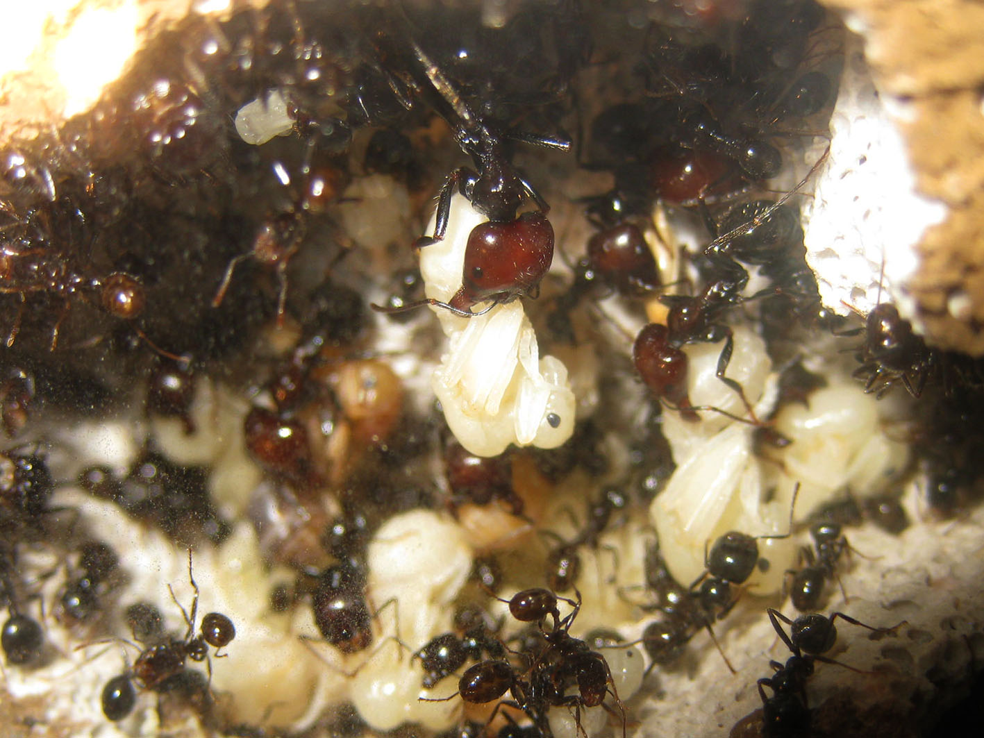 Intanto vi posto alcune foto scattate che mettono in evidenza alcune similitudini nel comportamento della mia colonia e della sua, che sono: la presenza di alcune regine che si comportano come operaie (dealate); la nascita di un numero di operaie piccole superiore a quella dei soldati prima della produzione di alati; la pigmentazione dei maschi in tonalità nero-grigio e delle regine tendenti al rossiccio.