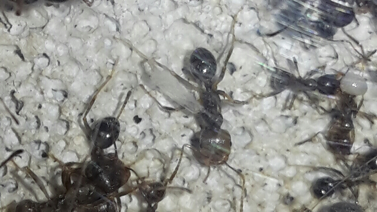 Prima c'è n'erano 3 ma un maschio è entrato da chissà dove è ne ha fecondata una (l'ho trovato ancora vivo appoggiato in arena, ma è morto poche ore dopo; non era della colonia, lo avrei visto fra le circa 70 operaie + 4 regine).