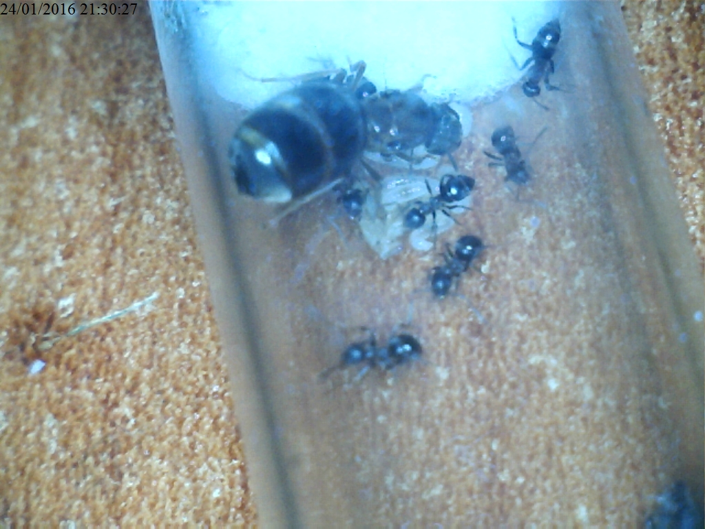 La colonia è a 28 gradi e la nutro con miele tutti i giorni, mentre offro insetti vari una volta a settimana.