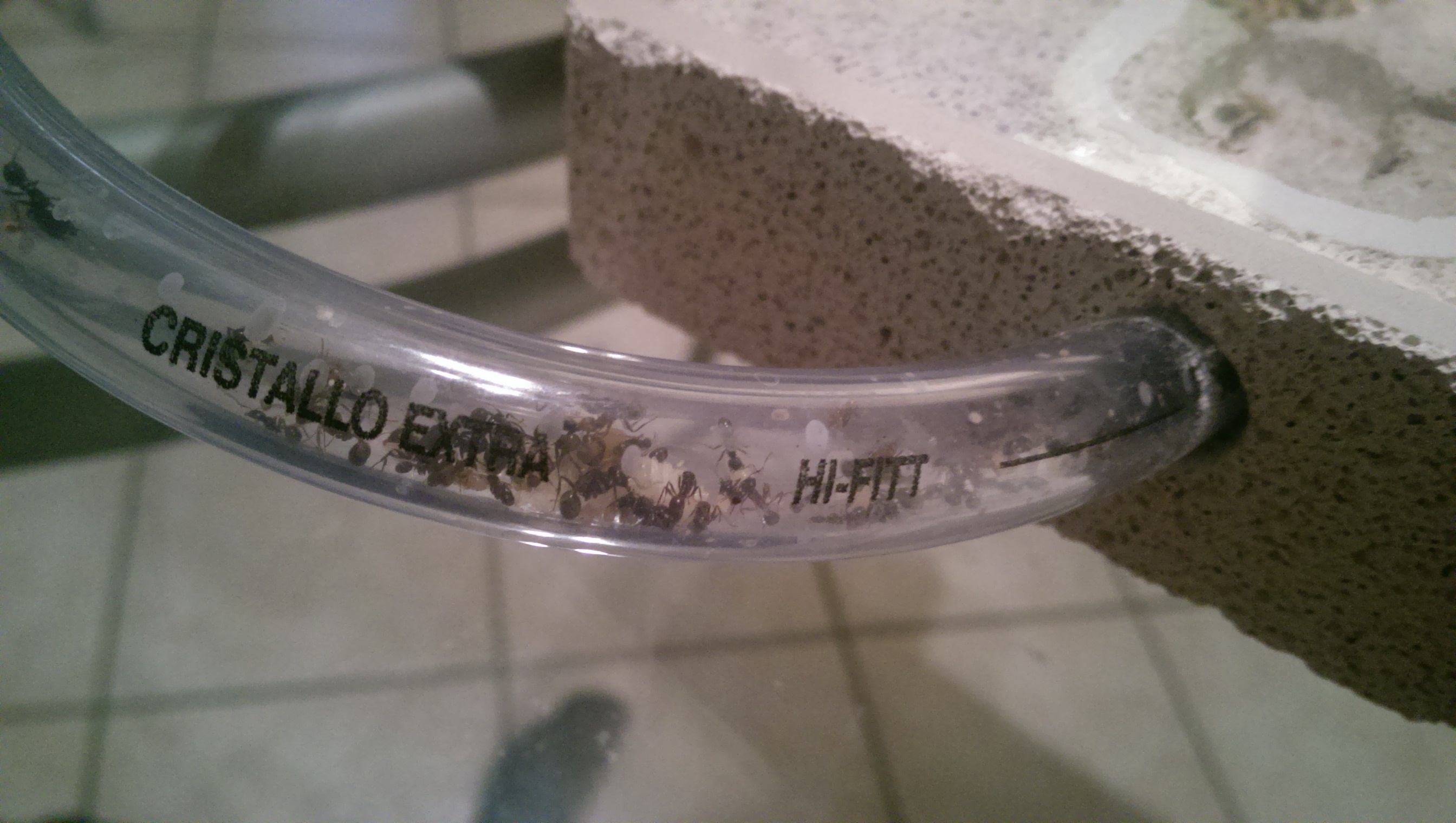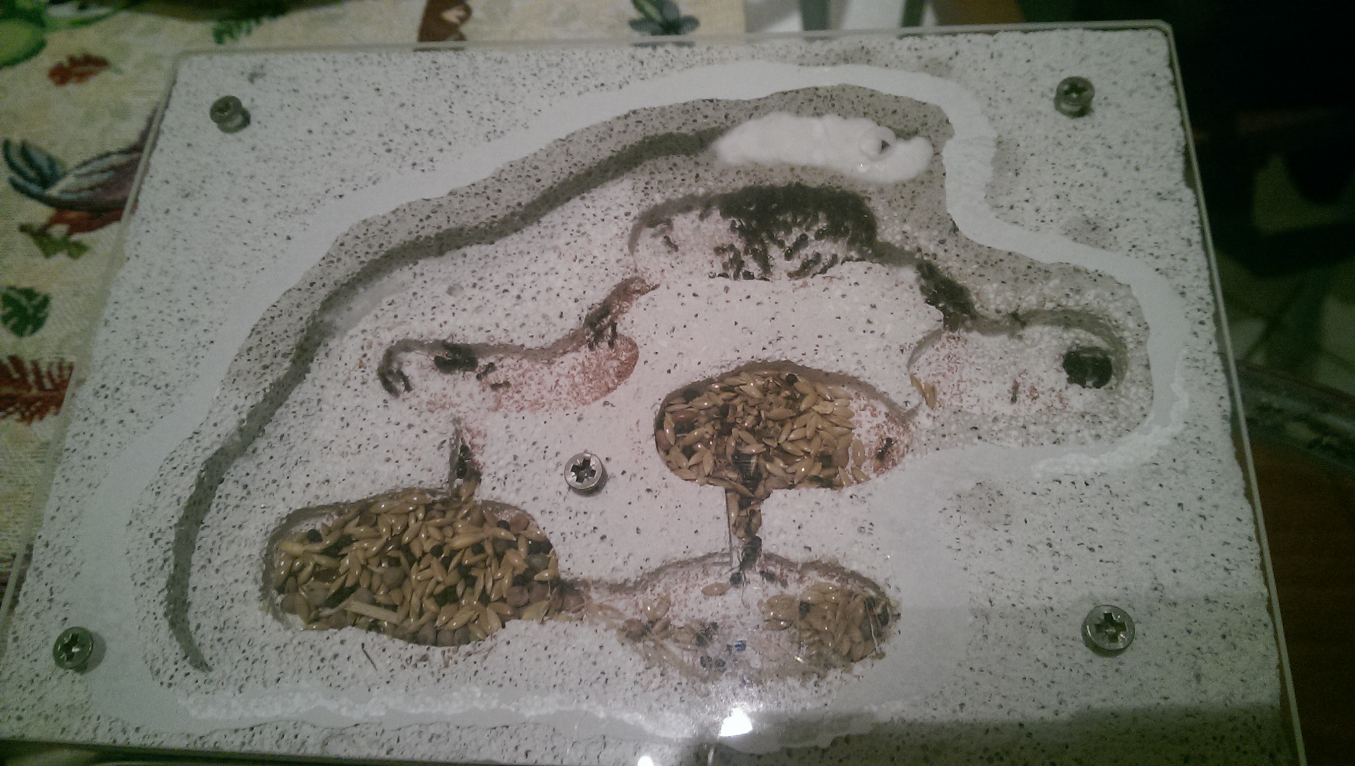 Arrivata di consuetudine insieme a un ordine di provette dalla spagna a settembre 2014, la colonia contava 8 operaie..ora io non sono un precisino con le date, ma dopo un periodo di semi stasi invernale in cantina, a febbraio di quest’anno ho riportato la colonia a temperature di casa e ho aperto la provetta in una piccola arena. Le deposizioni hanno cominciato subito ad essere abbondanti, e a luglio eravamo già sulle 50 operaie, qualche medium e sempre una buona scorta di pupe e larve. Ho deciso cosi di costruire il mio primo vero formicaio con arena staccata e collegata dal solito tubo. Ho inserito la provetta in arena, ho oscurato il nido e ho lasciato decidere a loro se e quando trasferirsi. All’inizio il nido è stato usato per stivare i semi, e poi piano piano, hanno cominciato prima ad occupare il tubo, e poi si sono decise a fare il grosso passo, tutto in poco meno di un mese. Ora le operaie sono più di cento, mangiano grilli e disprezzano le camole, in arena hanno due provette, una con acqua e una con acqua e zucchero, e preferiscono come si sa quella senza zucchero. Un aspetto da cui si scostano le mie messor rispetto alle schede e ai consigli che trovo in giro, è l’amore per l’umidità. Ho notato, specialmente nella fase di trasferimento, che se bagnavo il cotone che vedete sopra il nido, portavano la covata nella stanza piu umida, quando poi lasciavo asciugare il cotone per due giorni, portavano di nuovo la covata nella provetta che era ancora la loro casa ufficiale. Ancora adesso, e si vede dalle foto, quando il cotone si asciuga, portano la covata nel tubo, che essendo ovviamente più isolato del gasbeton ha un’umidità più alta, quando poi la sera bagno il cotone loro riportano tutto all’interno. Quindi il prossimo nido che faro per questa colonia avrà un metodo di umidificazione piu semplice e stabile, come si fa per colonie che amano l’umidità. Almeno per una zona del nido, lasciandone un’altra completamente asciutta per stivare i semi. Questo inverno penso che non porterò la colonia in cantina, propio ieri ho trovato un bel mucchietto di uova fresche,non vorrei bloccarne lo sviluppo.