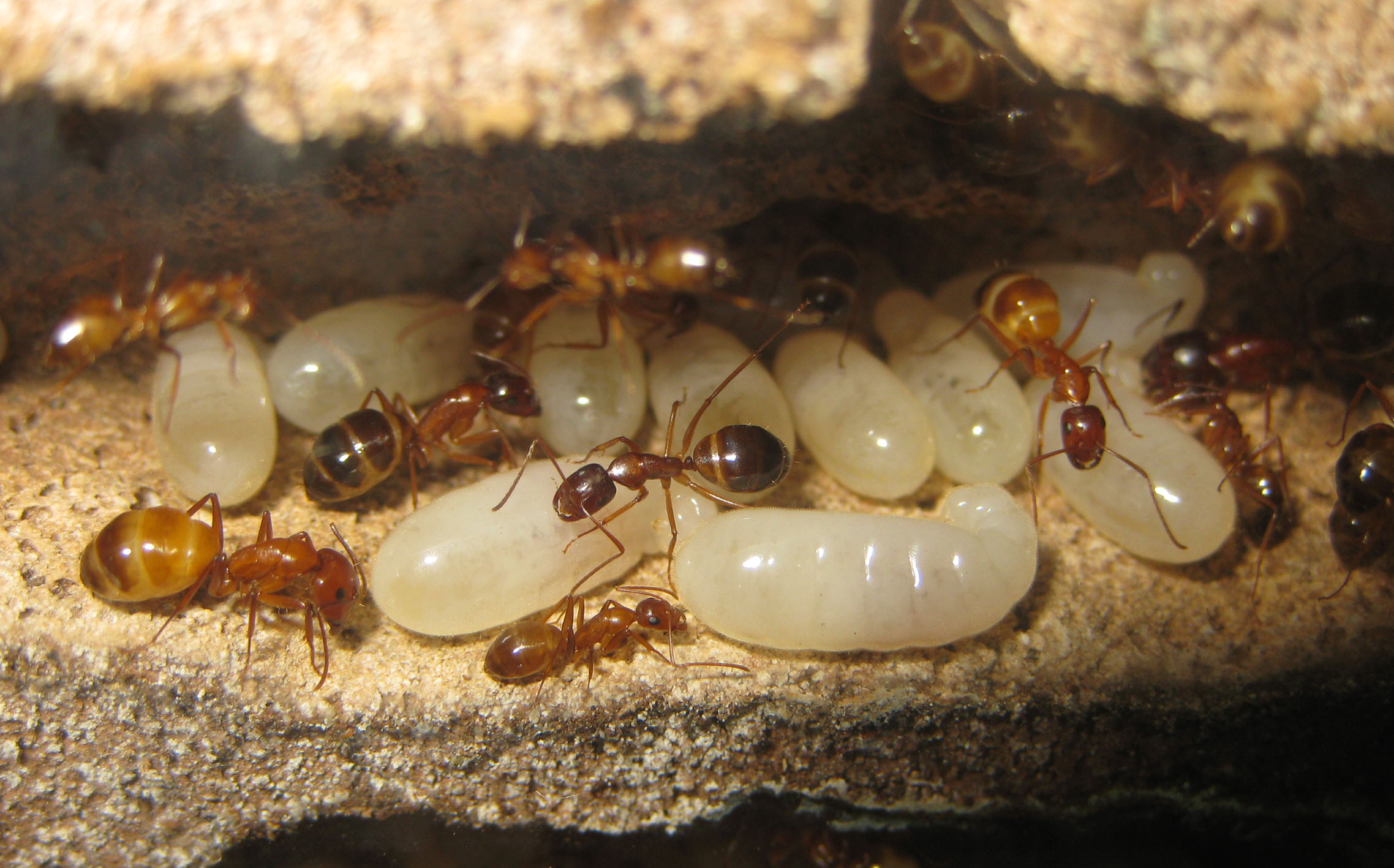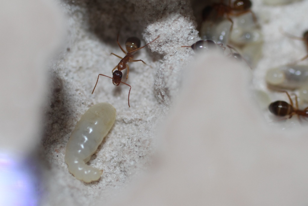 Infatti già due persone, un siciliano e un mirmecologo, hanno ammesso di non aver mai visto degli adulti della specie di questi colori. Ovvio, visto che non escono mai dal nido in questa fase! Possiamo vederli solo noi che li alleviamo, o forse scoperchiando un sasso che li ospiti, altrimenti stanno sempre nelle stanze più riparate!