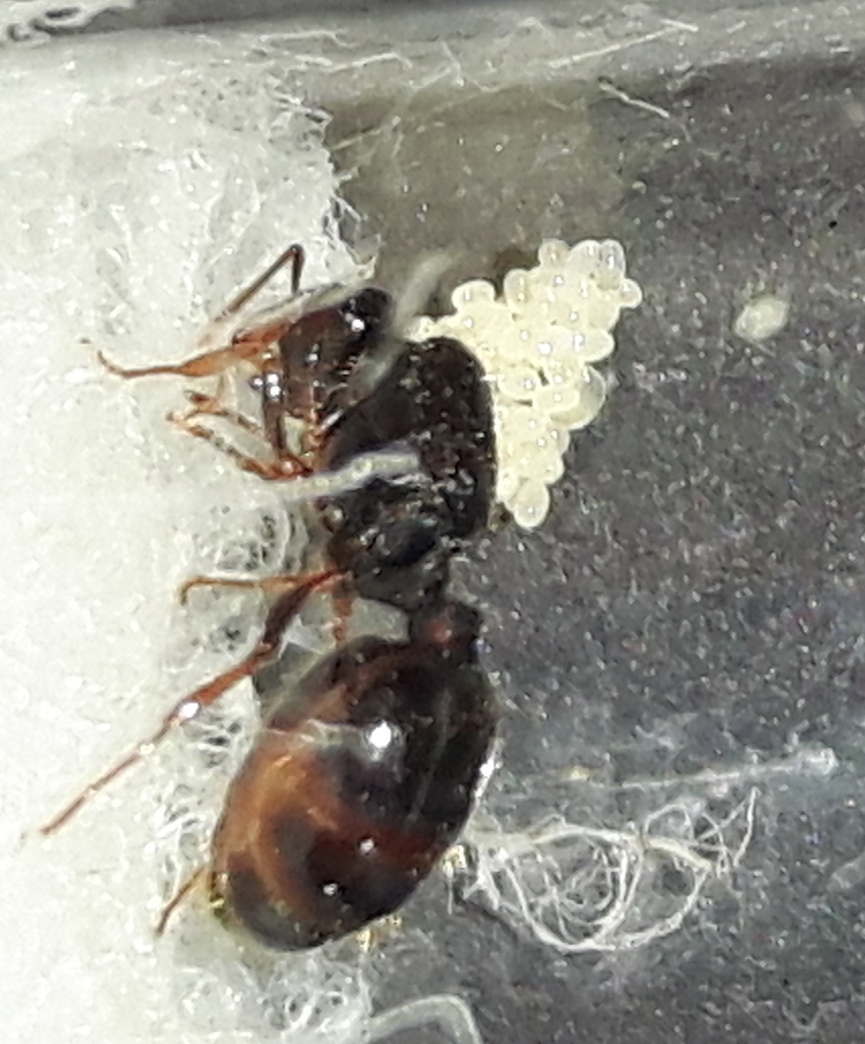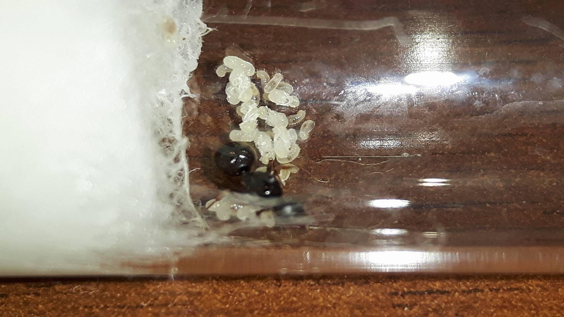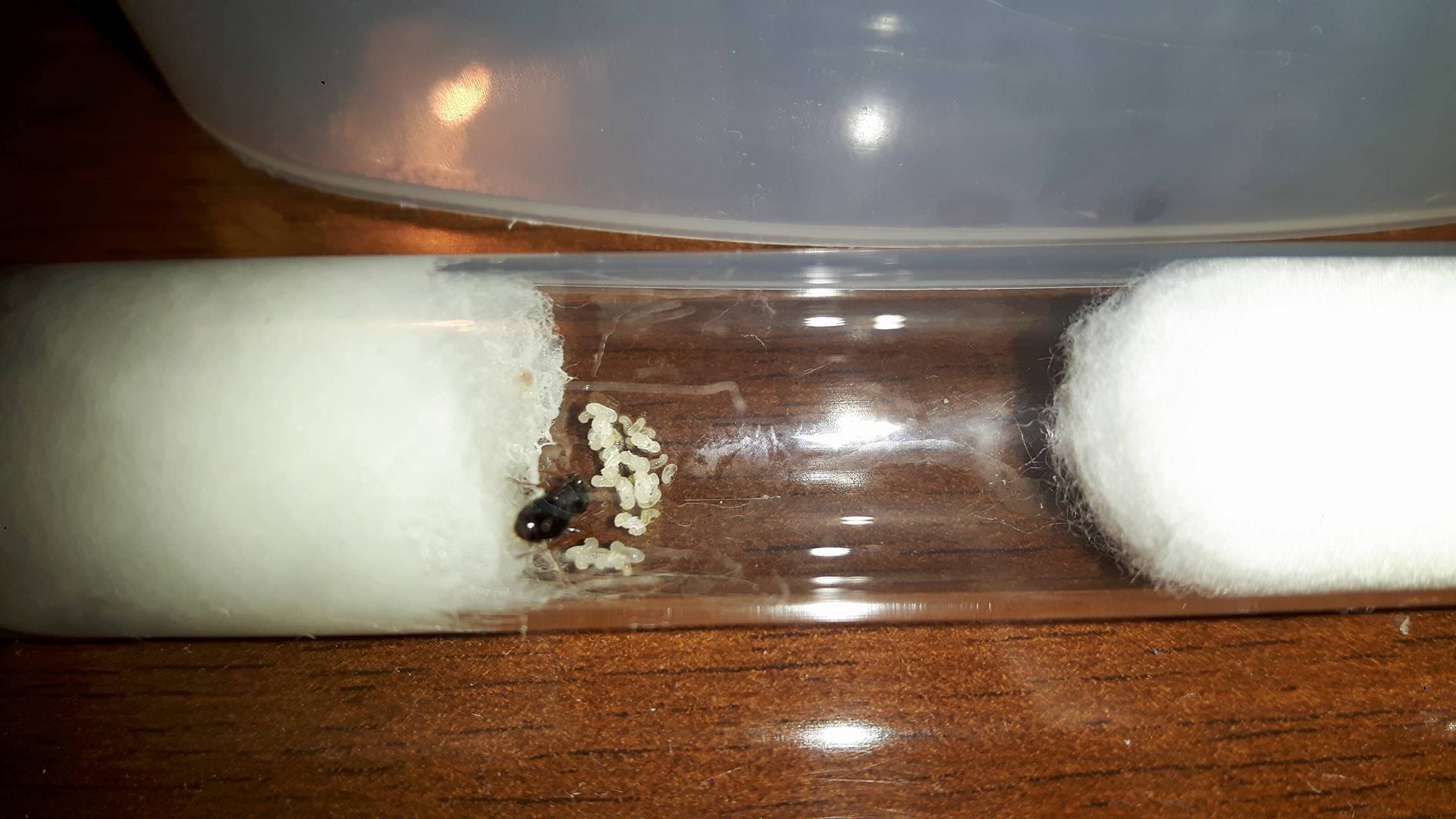 Una rapida osservazione e posso gia notare una quindicina di uova, le due regine sembrano per il momento solitarie: una cura un gruppetto abbondante di uova vicino al cotone con l' acqua, l' altra si mantiene sopra 3/4 uova vicino all' uscita della provetta.