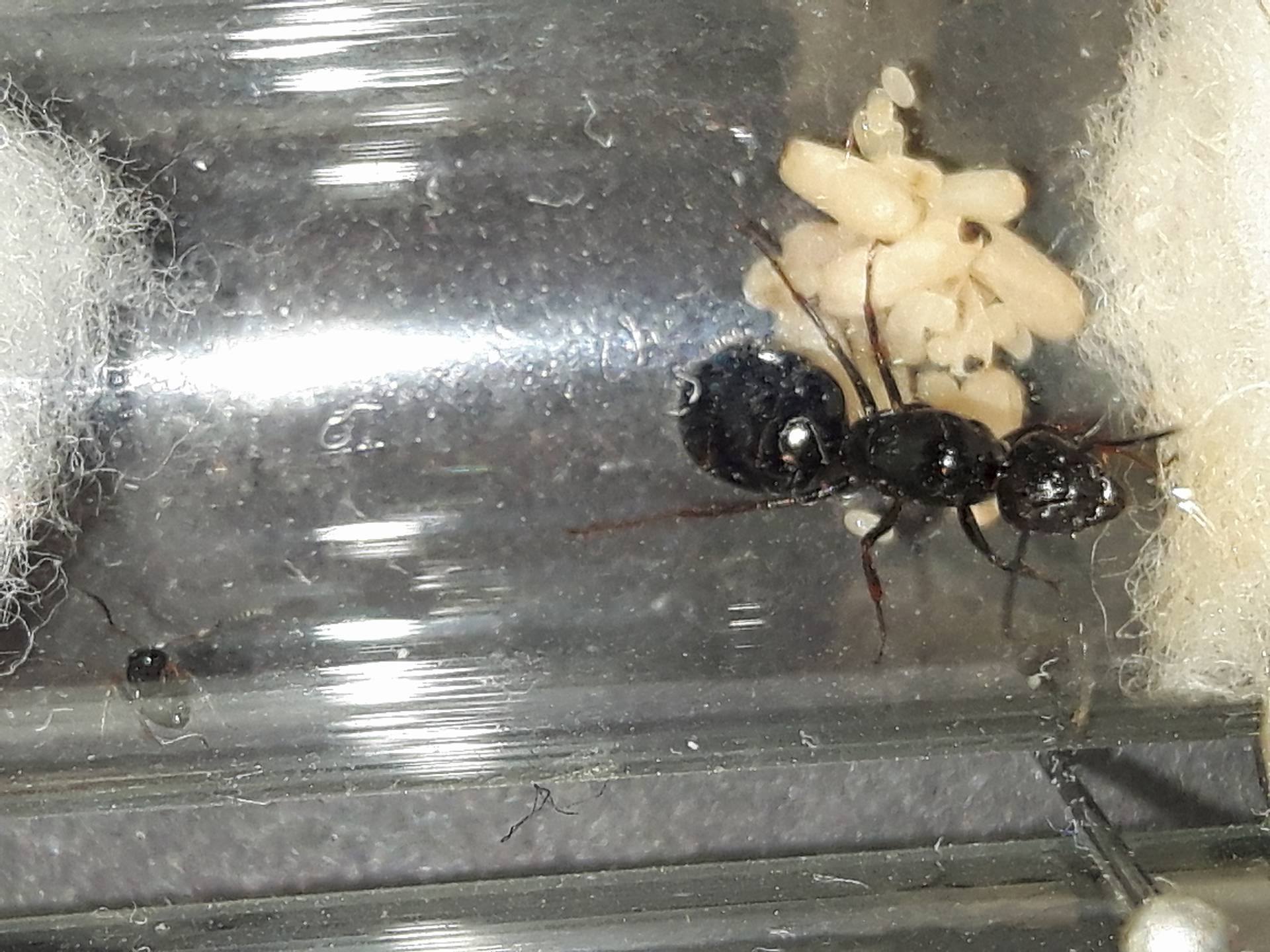 Guarda la testa dell'operaietta di Camponotus: se è rossa è lateralis, se è nera è piceus. Però c'è qualcosa di insolito! Quella prima covata così abbondante è strana sia per l'uno che per l'altro. Confermi, come dicesti nella prima richiesta di identificazione, che la regina è lunga meno di un centimetro? Per caso le hai dato tu parte della covata? Qual è la data di ritrovamento? E dove (a terra, nel legno, sotto un sasso...)?