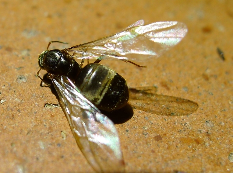 Non mi sembra siano uguali alle altre regine che ho visto in giro contemporaneamente e che ho pensato potessero essere Lasius emarginatus, queste mi pare abbiano il torace del colore del resto; Cremona, 28 giugno 2016, trovate morte alla base di un muro rivolto a sud.