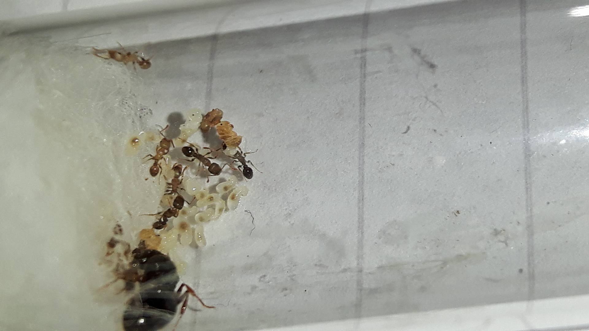 Grande aggiornamento per la mia Tetramorium, ho appena controllato e sono sfarfallate 5 operaie + altre pupe quasi pronte; le operaie nate sono ancora ambrate per cui sono molto giovani.