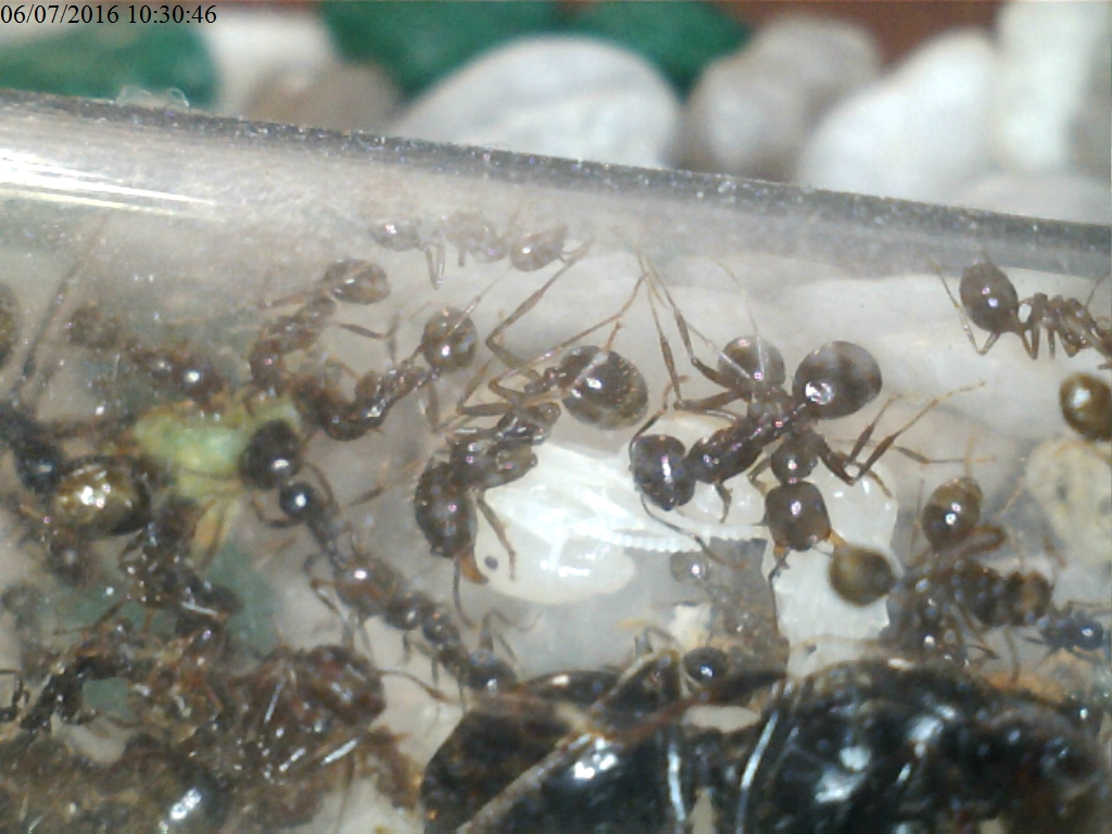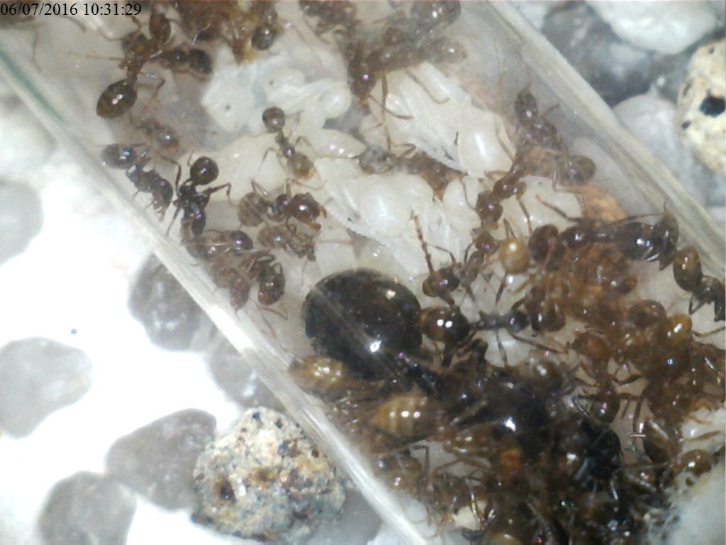 Ad oggi, la regina sforna uova quasi quotidianamente e la colonia è formata da molte pupe e larve. Fra le operaie, c'è la prima major di grosse dimensioni (1 cm e 2 mm). La colonia si nutre prevalentemente di proteine (blatte) e semi. Ho provato ad offrire il fico, che non è stato minimamente calcolato!