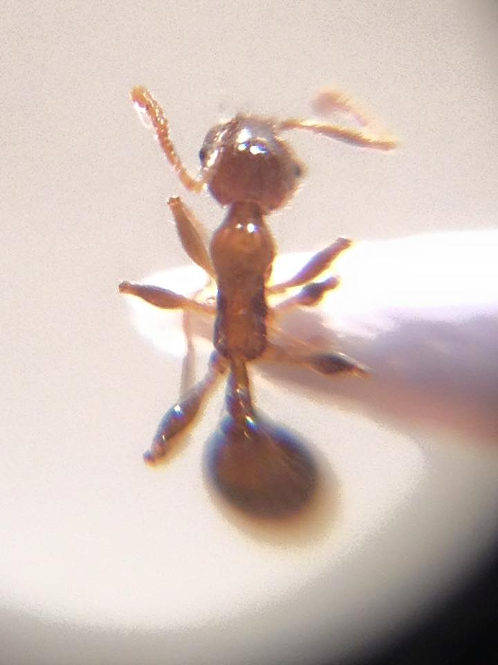 Ah, volevo anche farvi notare quanto sia effettivamente forte la somiglianza con P. pallidula. Non si tratta solo del torace, notate anche la forma del peziolo che è molto insolita per un Temnothorax: è molto peduncolato ed ha in pratica proprio la stessa forma che in P. pallidula. E infine la testa: molto diversa dagli altri Temnothorax nostrani e molto più simile a quella della P. pallidula per forma, scultura, aspetto degli scapi e peluria particolarmente eretta sugli scapi.