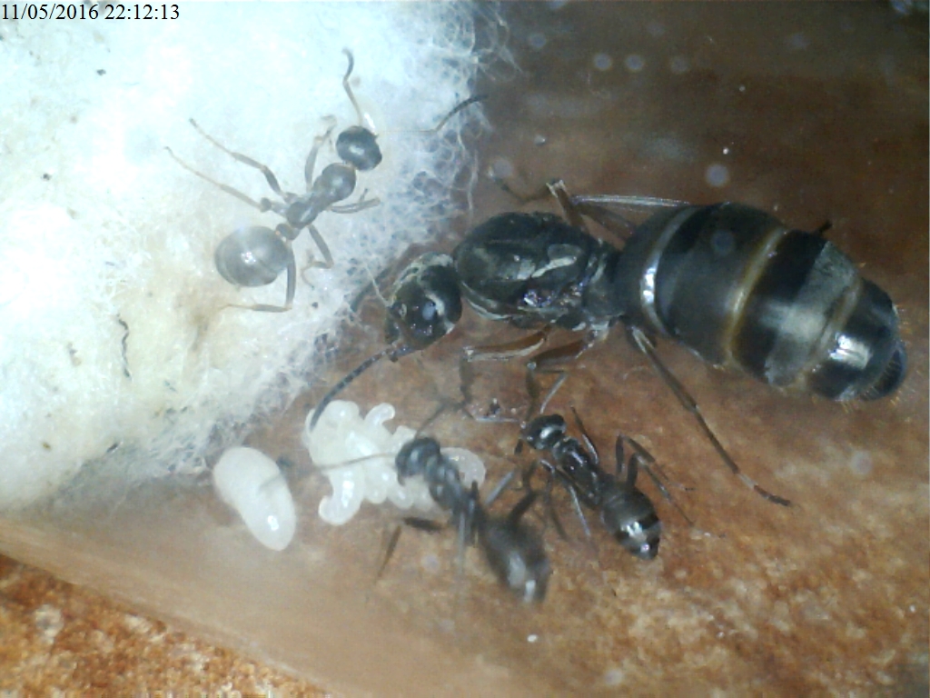 La situazione è spaventosa: la regina sforna uova tutti i giorni, le larve sono circa 120 ed alcune di esse iniziano ad impuparsi. Alimento la colonia tutti i giorni con miele e una volta a settimana offro un adulto di Plodia interpunctella, oppure comunque altri artropodi dal corpo molle. Due operaie (era chiaro, mi sono meravigliato che non siano morte prima) sono morte, probabilmente per vecchiaia.