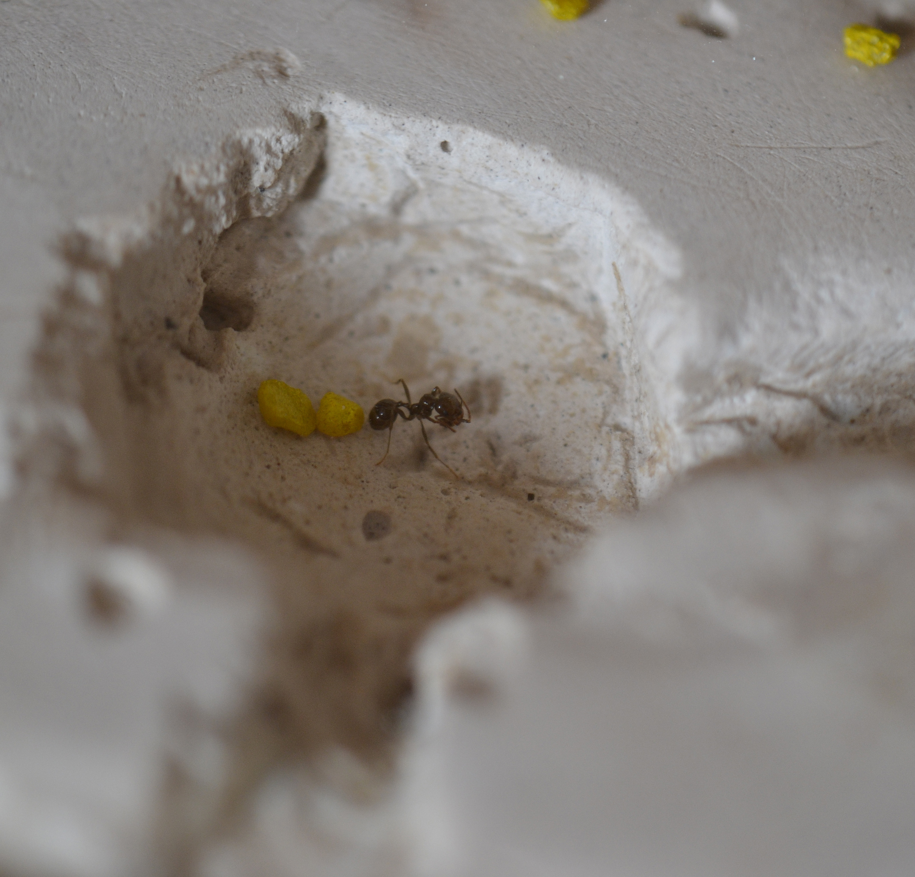 Le formiche hanno inizialmente occupato 2-3 stanze, una per la covata e le altre due per immagazzinare i vari semi. Stamattina però, ho notato che anche le altre sono state utilizzate, (di quest'ultime) soprattutto la più grande in basso a sinistra, dove hanno portato alcuni dei semi già introdotti nel nido (probabilmente in quanto è una delle stanze più secche).