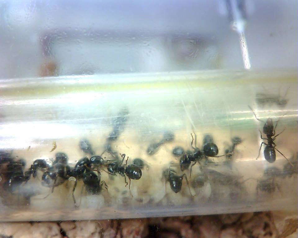 2014-08-16 - Il trasferimento è avvenuto molto a rilento.. La regina non ne voleva sapere di trasferirsi.. E' rimasta circondata dalle sue ancelle nei pressi di un grappolo di uova che misura il doppio del suo addome. Ho notato che le operaie che si sono trasferite hanno creato 2 poli dentro il formicaio. 1 vicino al gasbeton umido e l'altro in una stanza dal lato opposto. Immaginavo si sarebbero tutte ammassate e invece il contrario. La regina alla fine l'ho fatta cadere in arena insieme alle uova e le operaie che erano rimaste in provetta. Ci ha messo un bel po' per trovare il passaggio verso il formicaio vero e proprio. In un primo momento si è allontanata dalle altre operaie che le facevano "gruppo" sopra e si è spostata da sola in zone dell'arena deserte. Le operaie al contrario delle altre Lasius o Formica, non sembravano in grado di trasportarla. Mi ha stupito abbastanza questa cosa.. presto vedrò che succede con la colonia 1
