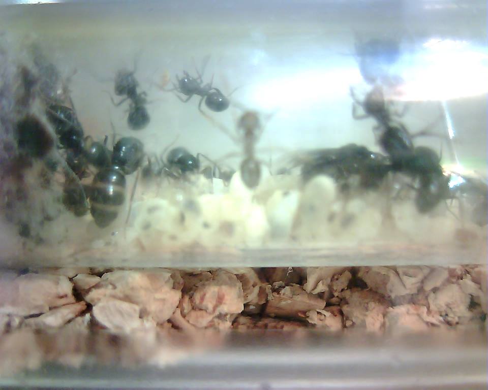 2015-03-09 - Ecco sua maestà circondata da varie operaie super attive. Si vedono fuori fuoco anche le uova, le ne tiene in bocca una. Come altre regine di questa specie sono molto attente alla prole e anche dopo che ci possono essere altre formiche che si occupano di loro, la regina non manca mai di ripulirle e coccolarle