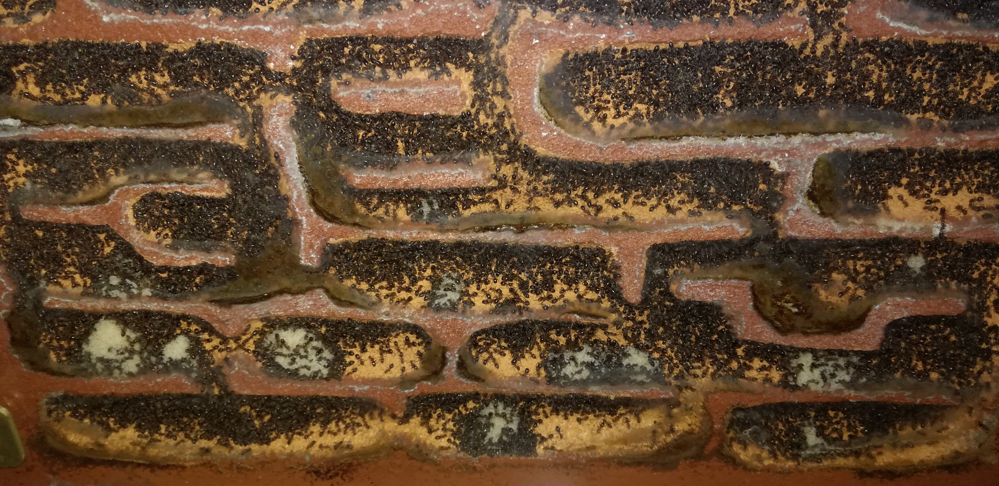 Ho avuto la fortuna di poter recuperare tutto il materiale necessario poco prima della chiusura della maggior parte delle attività. Conclusa l'opera ho atteso qualche giorno come da manuale per eliminare eventuali odori fastidiosi e ho collegato i due nidi. Questa volta sono state più restie ad abbandonare la vecchia casa, nonostante avessi iniziato a nutrirle dalla nuova arena e avessi smesso di umidificare il vecchio blocco cercando di renderlo il più inospitale possibile. Inizialmente con le larve invernali ancora inattive non si sono mosse e solo qualche sporadica esploratrice si avventurava tra i nuovi spazi. Successivamente appena iniziarono a consumare le proteine decisero, sempre con grande lentezza, di spostare la covata nelle nuove camere più umide. Bisogna dire però che prime camole e insetti vari si sono ostinate a portarli fin nella vecchia casa pur di non traslocare, operando un trasporto sicuramente svantaggioso e superfluo ai nostri occhi ma a quanto pare con un senso per loro. Un mese esatto e anche la regina si è trasferita, ultima in quanto tutta la covata era già stata trasportata compresi i primi bozzoli di stagione. Nelle ultime due settimane la marea di larve è stata accompagnata da un'ingente comparsa di pacchetti di uova presto accumulati in un solo grande agglomerato. A stima direi che si tratti di qualche centinaio di uova.