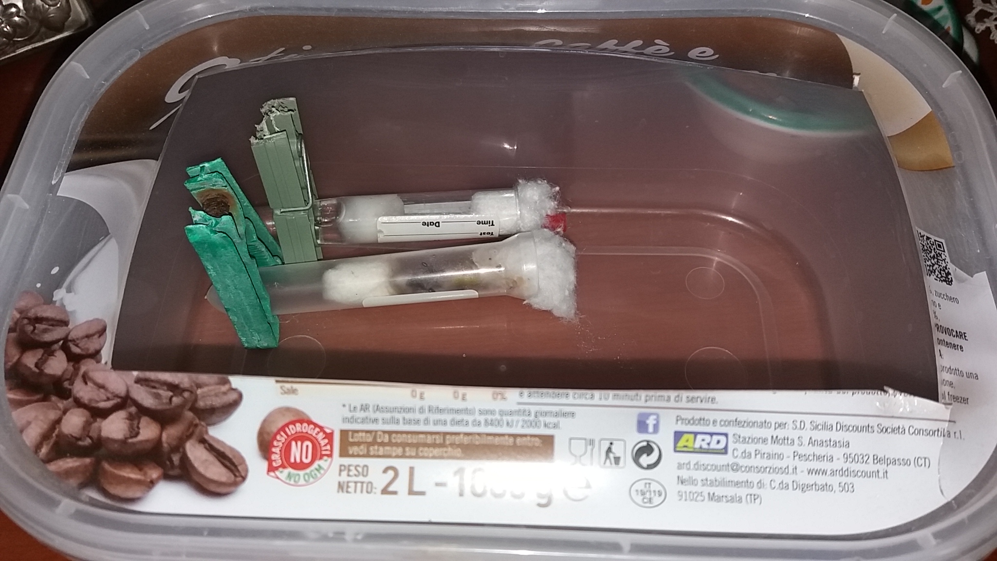 La provetta presenta molti problemi,vi era una operaia morta che probabilmente stava uscendo ed è rimasta invischiata nel miele (diluito ma abbastanza vecchio) è ormai è davvero sporca e piena di scarti che non spostano via.