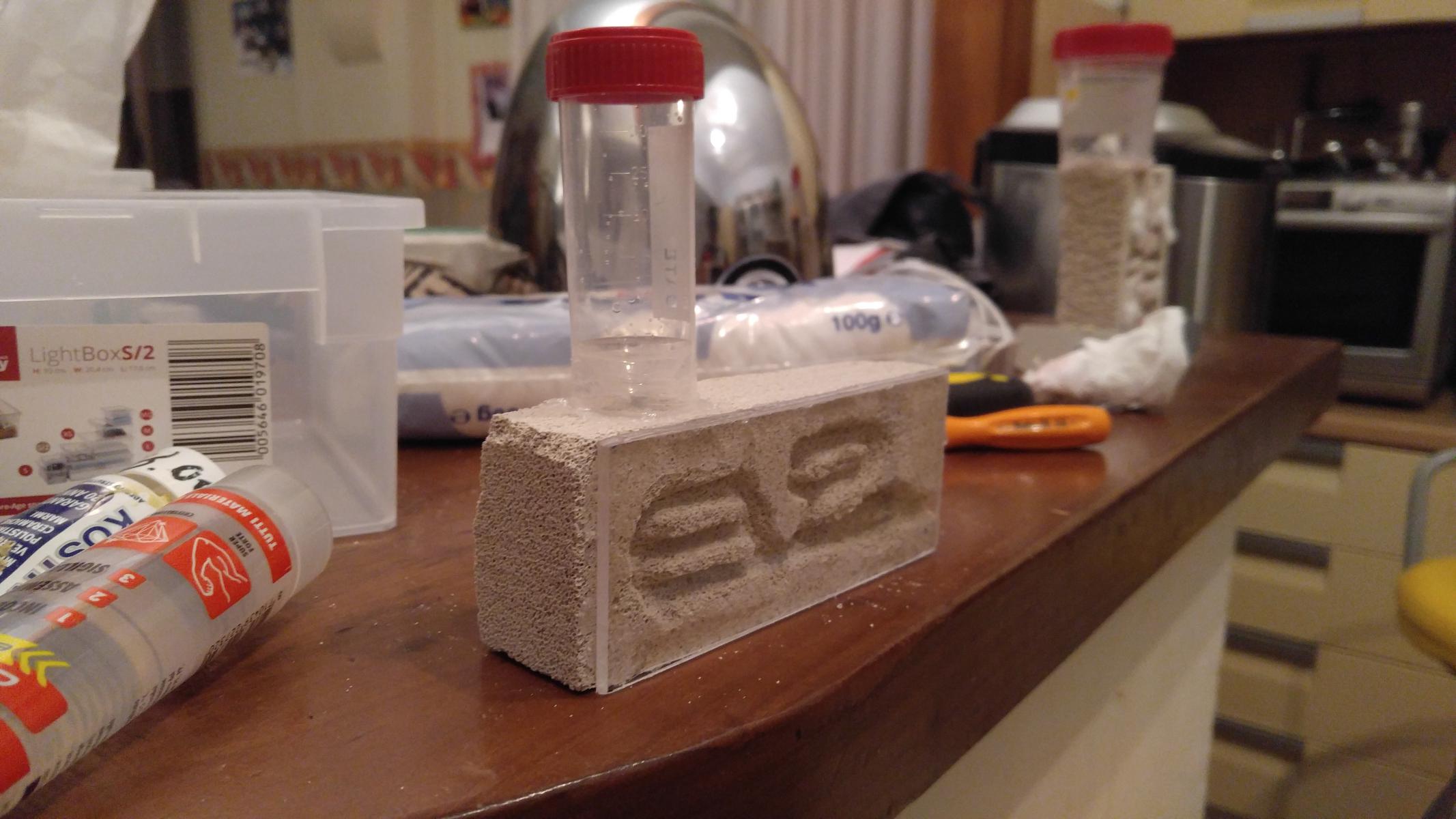 In questo nido invece l'acqua scende per gravita', di conseguenza devi stare molto attento a dosare perfettamente l'immissione di acqua (dimensionando i fori o aggiungendo del cotone sul fondo) altrimenti tutte le stanze del formicaio risulteranno molto umide, e l'acqua tendera' anche a trasudare dalla parte piu' bassa del nido, in quanto il gasbeton e' molto idrofilo.