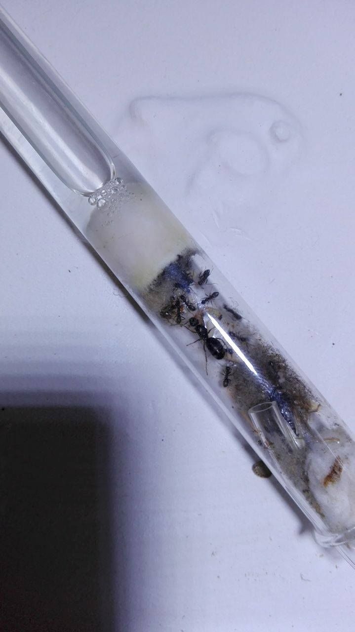 La situazione è spaventosa: la regina sforna uova tutti i giorni, le larve sono circa 120 ed alcune di esse iniziano ad impuparsi. Alimento la colonia tutti i giorni con miele e una volta a settimana offro un adulto di Plodia interpunctella, oppure comunque altri artropodi dal corpo molle. Due operaie (era chiaro, mi sono meravigliato che non siano morte prima) sono morte, probabilmente per vecchiaia.