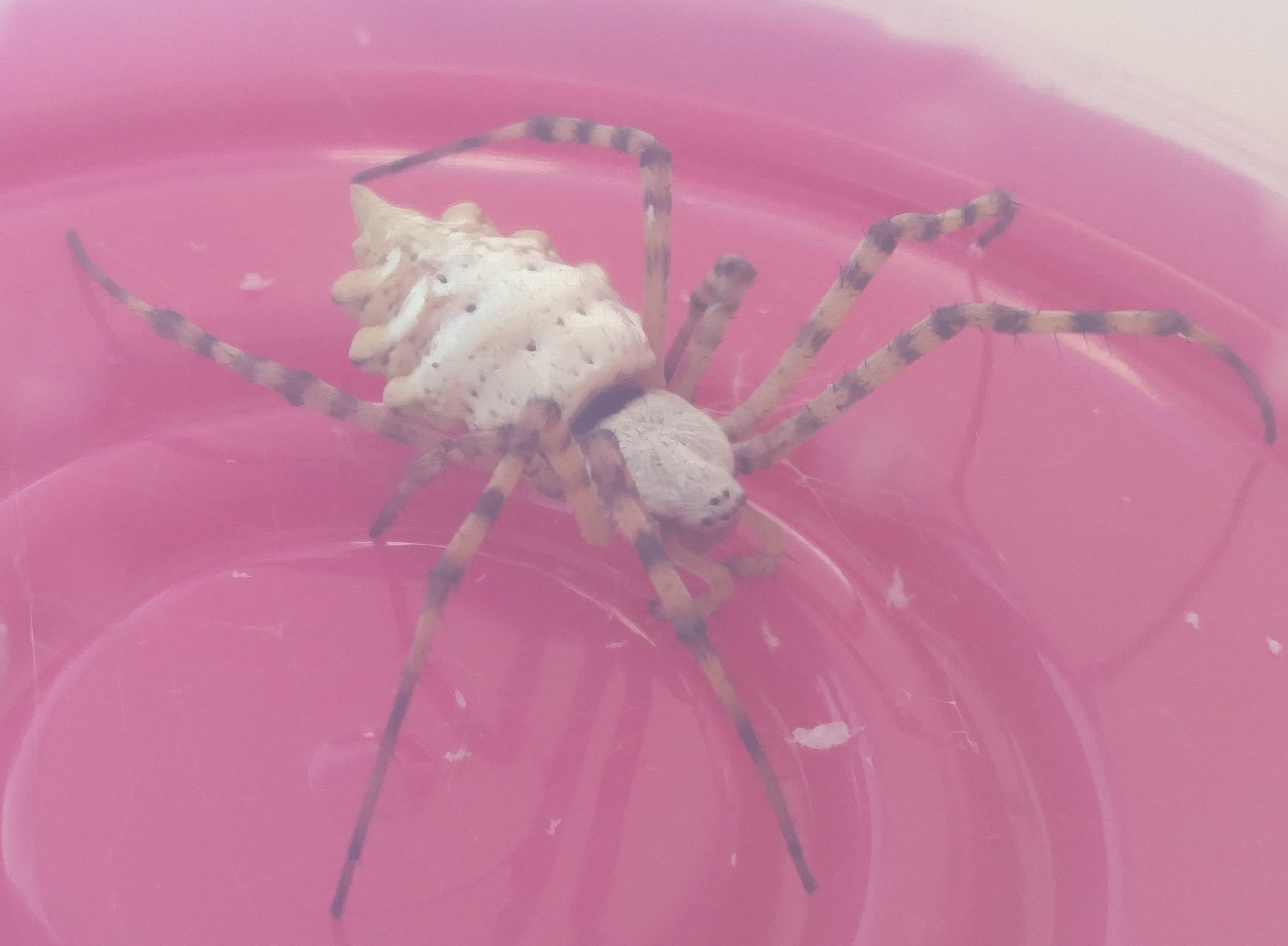 Temperatura ambiente, d'inverno non deve andare sotto i 20 gradi, la teca di un Argiope di quelle dimensioni deve essere grande sui 50x50x50 cm minimo con spazi di appoggio della tela