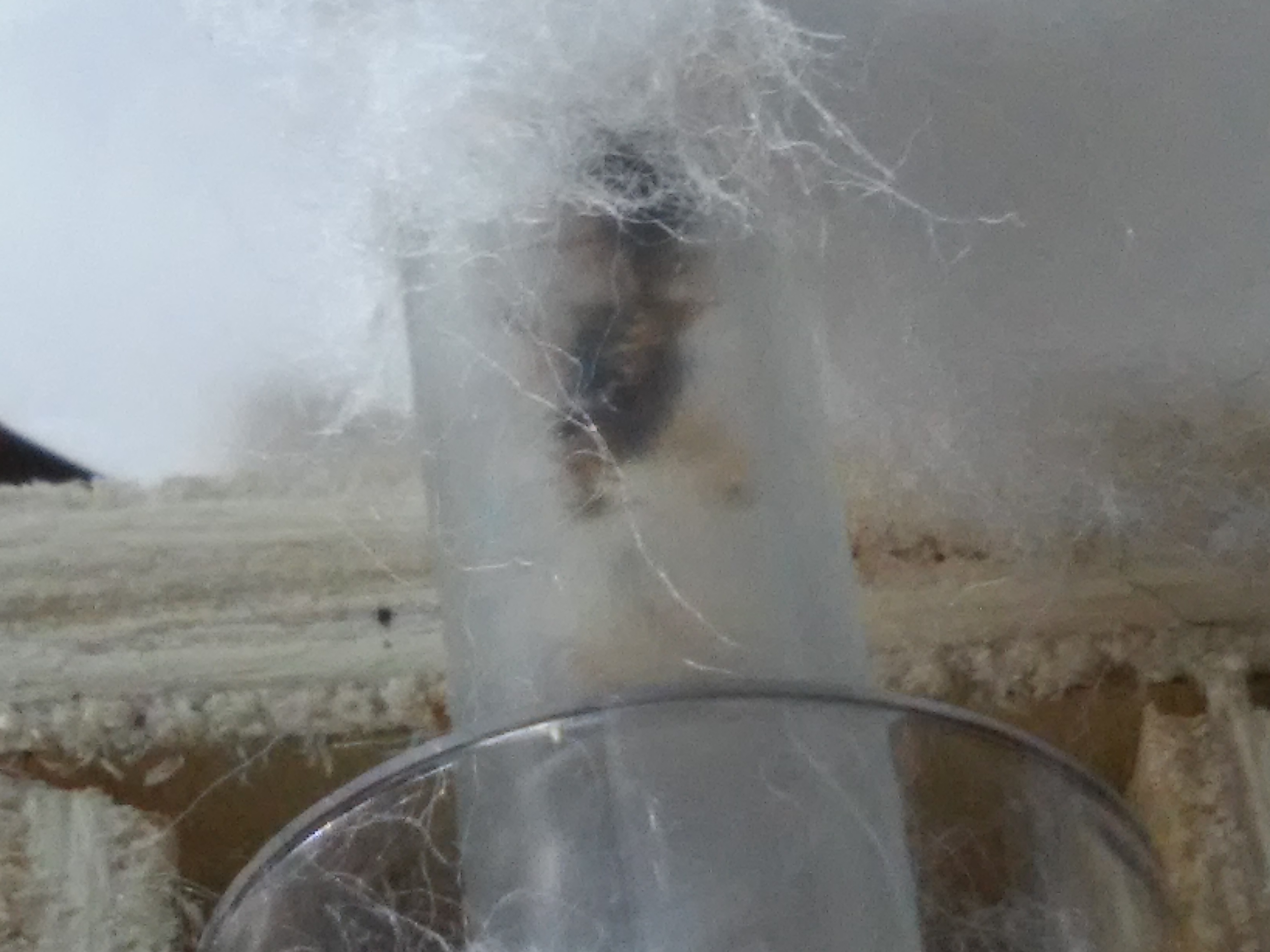 Qui la colonia B che trasporta un'ape verso il nido. Ritengo divertente il fatto che loro tentino di far entrare qualsiasi preda nel nido, comportamento molto diverso dalle colonie che ho di altre specie. Visto che le prede sono regolarmente troppo grandi, cominciano ad essere smembrate ed entrano a pezzi testa, zampe e poi il resto. Dopo un paio di giorni i rifiuti sono in arena (nel tappo!) e li rimuovo. Una vespa è stata invece completamente ignorata.