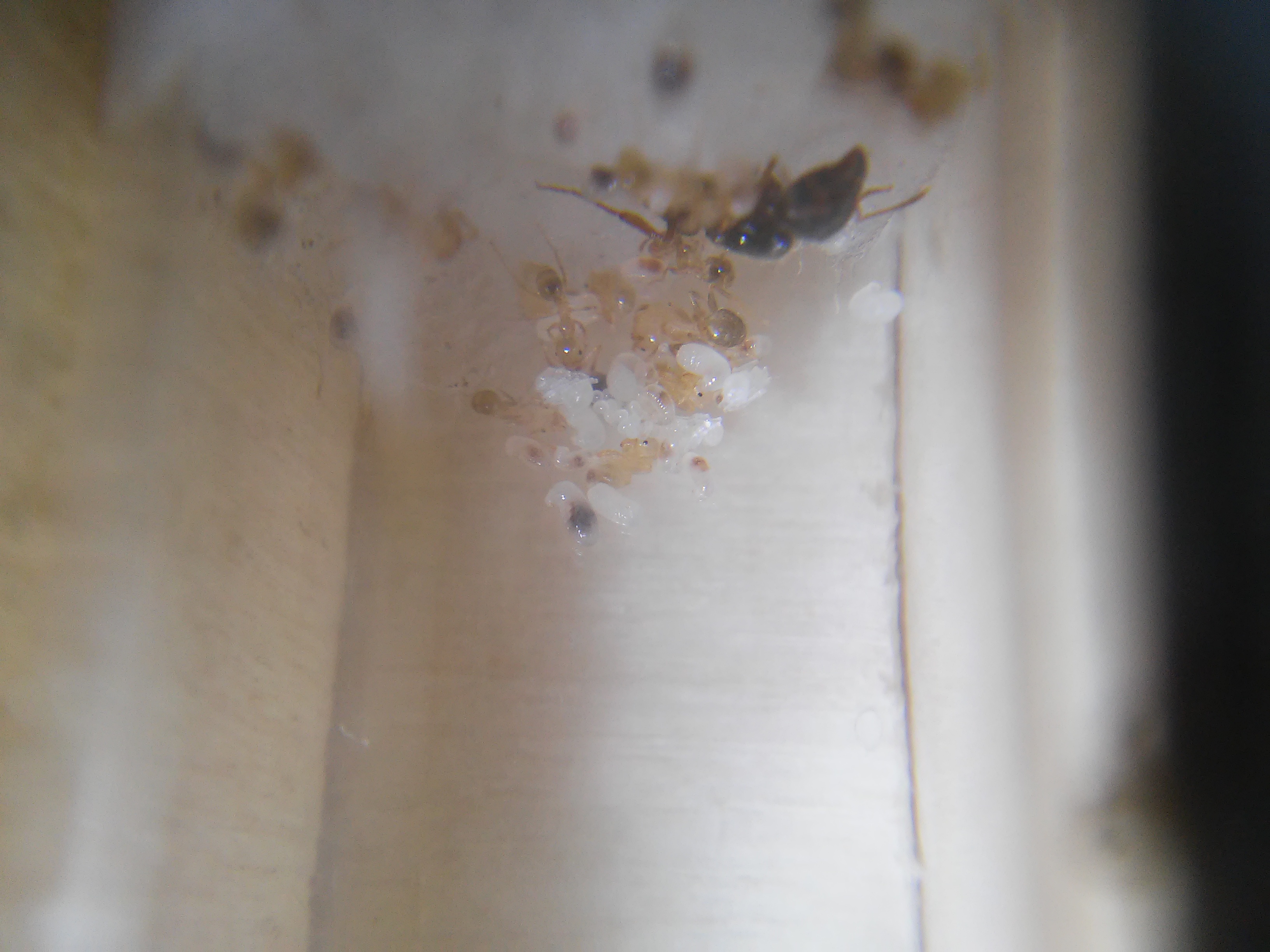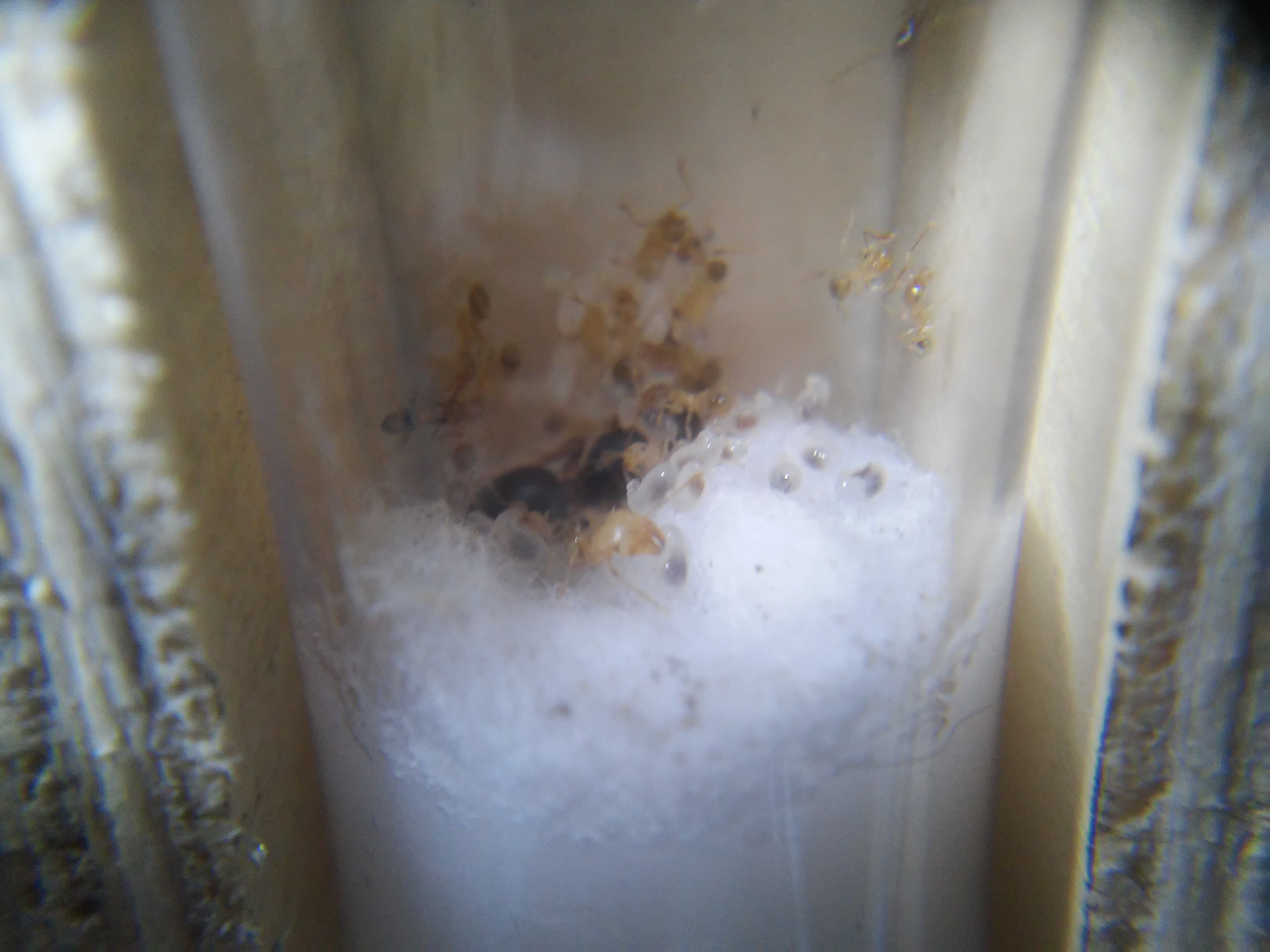Nelle colonie A e B sono presenti circa 30/40 operaie. La covata è piuttosto numerosa ed è tutta attaccata al cotone bagnato. Contemporaneamente, in entrambe le colonie è sfarfallato il primo soldato.
