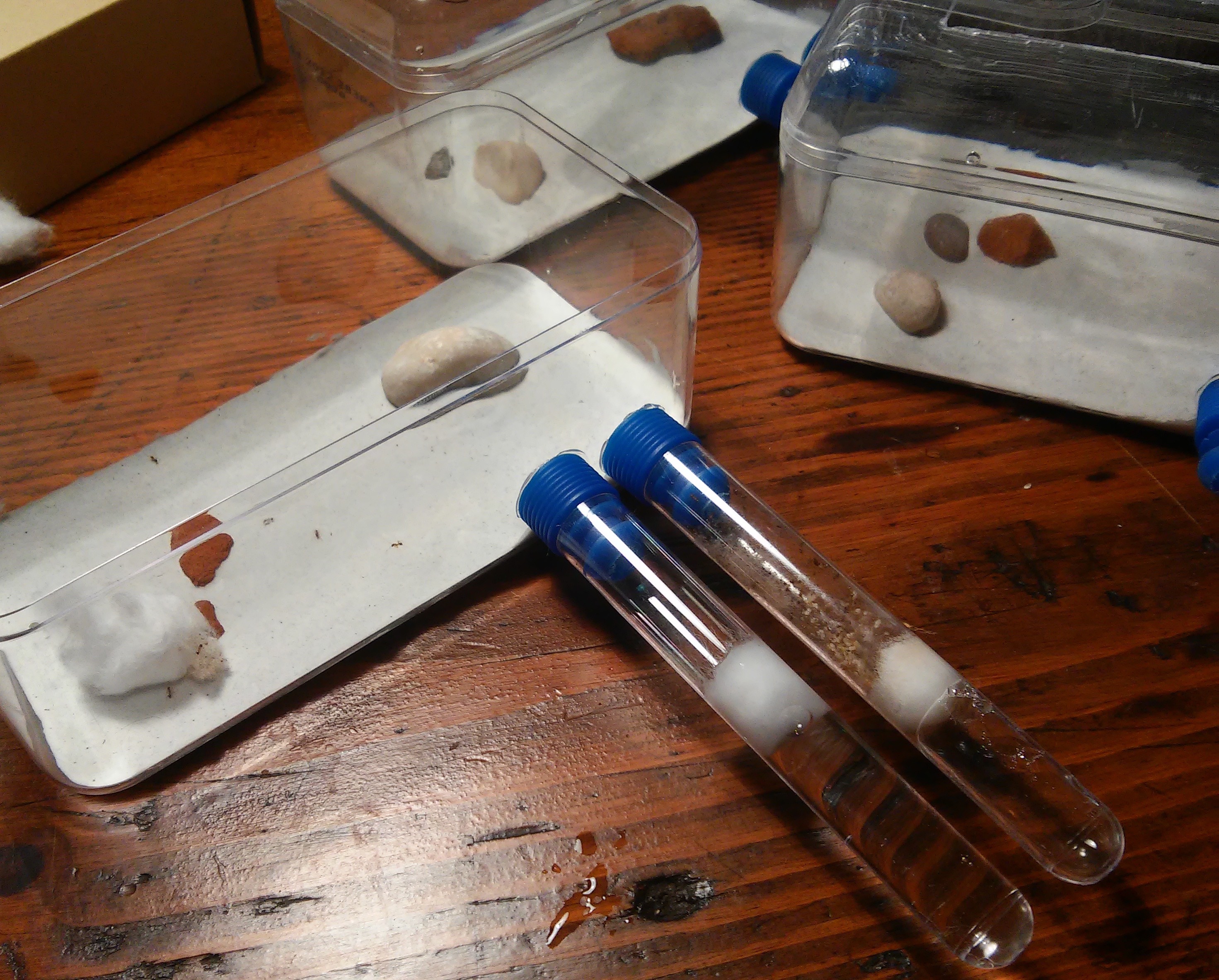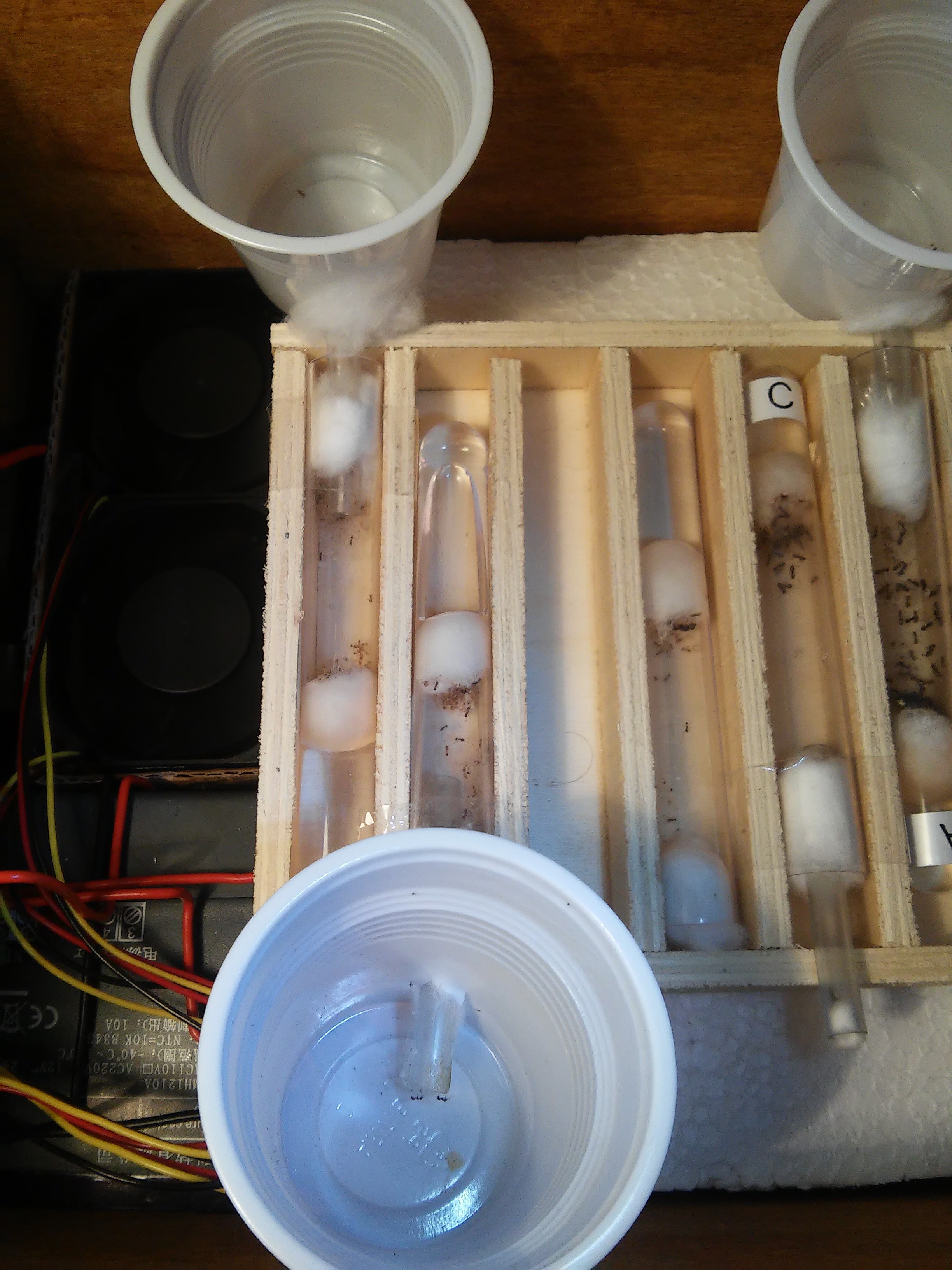 Per finire, questo è il setup dove al momento sono contenute (quasi) tutte le mie colonie. Dalle provette esce un tubicino che è inserito in un buco fatto nei bicchierini. Ho usato del cotone per tappare bene il buco nel bicchiere e dell'antifuga grasso+vaselina per contenere le formiche.