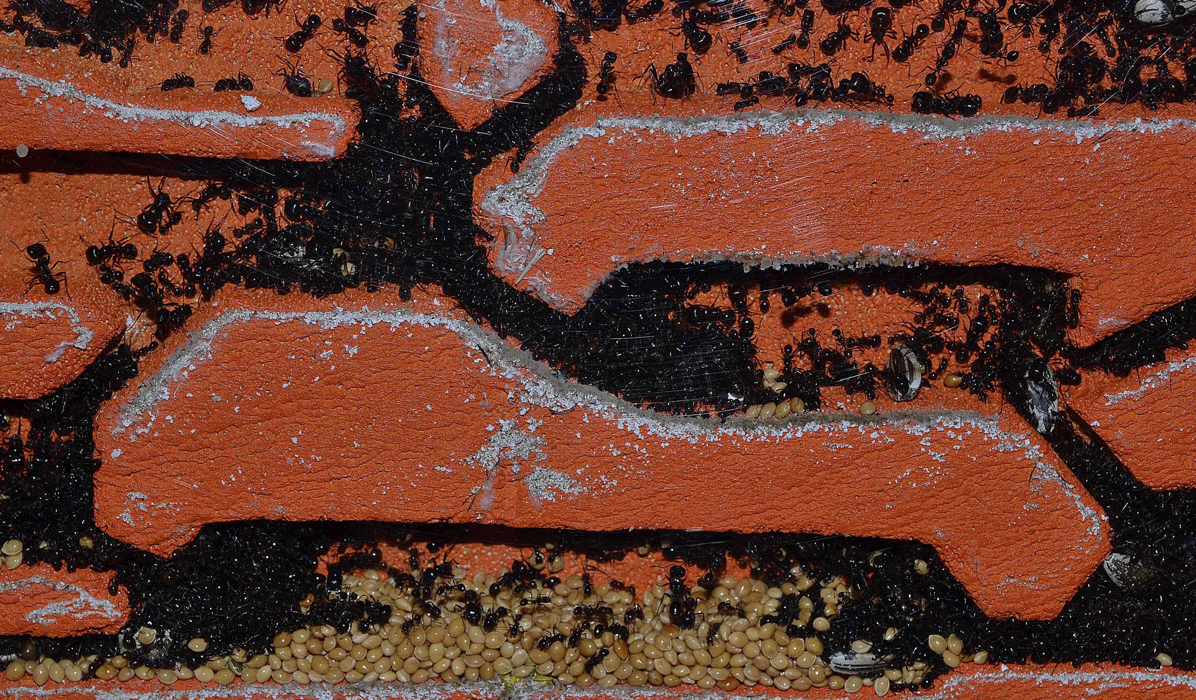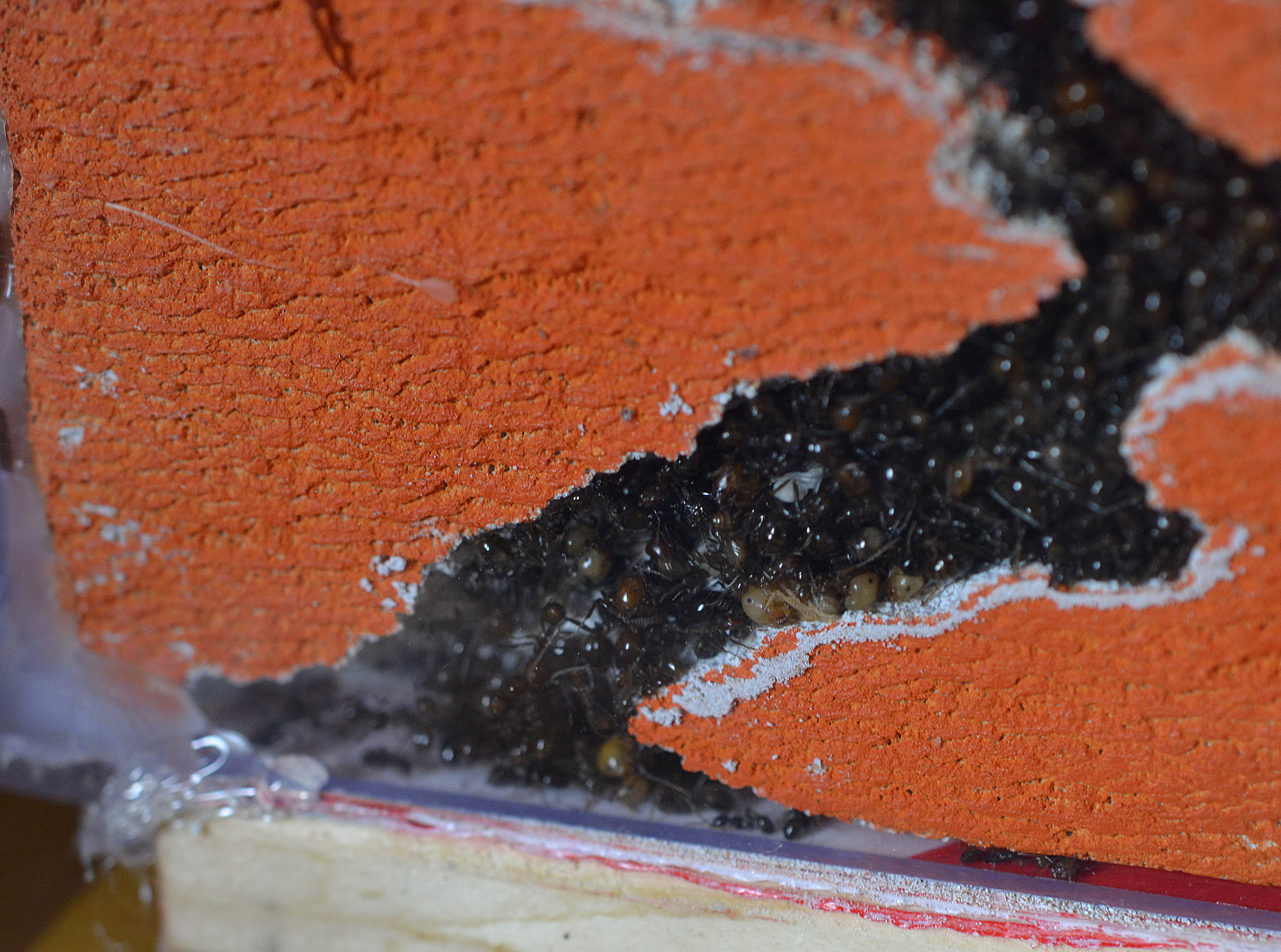 In questo periodo le operaie hanno continuato a scavare nell'angolo in basso a sinistra fino a raggiungere la base del nido. Una serie di listelli di plexiglass ha arginato le esploratrici e la situazione sembra essersi stabilizzata (tengo comunque monitorata la situazione).